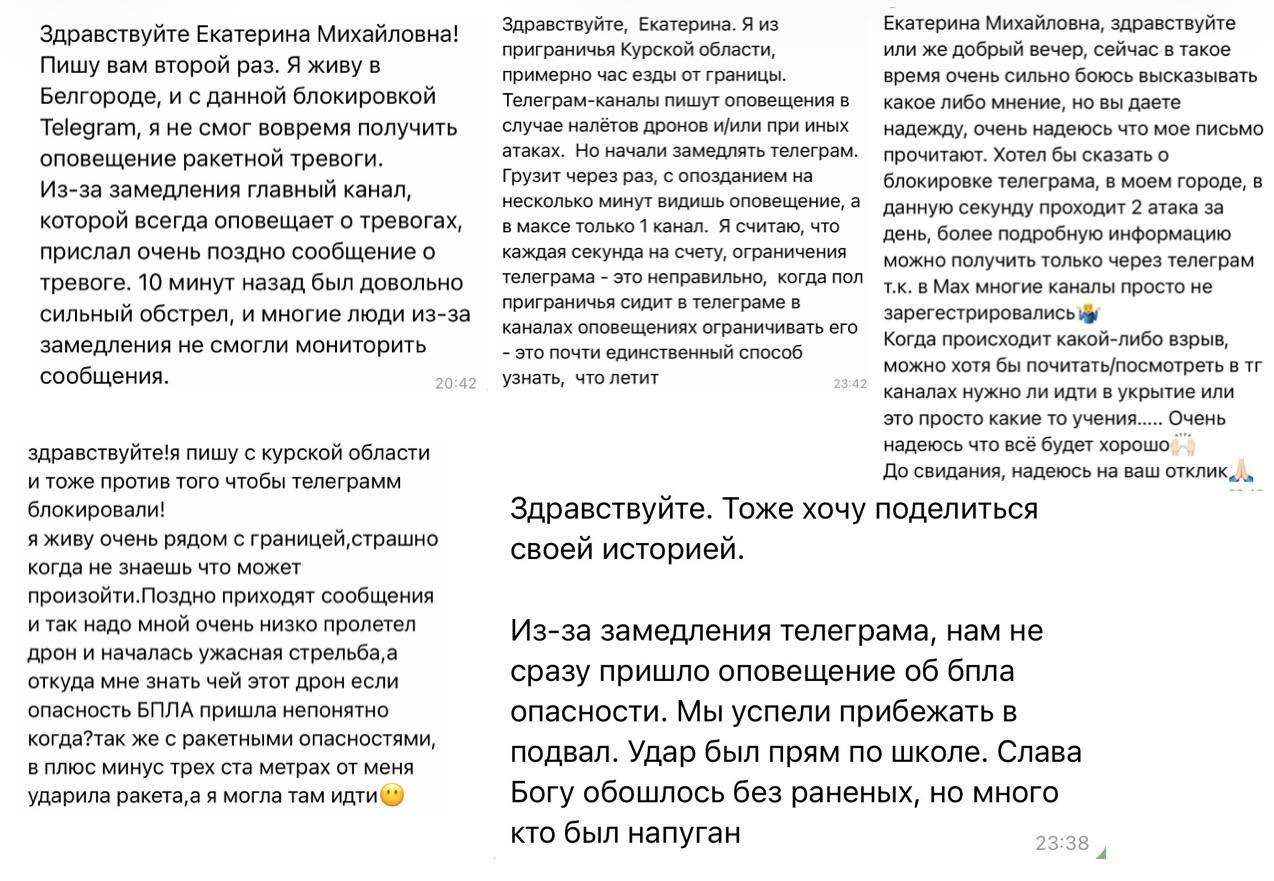 Глава «Лиги безопасного интернета» Екатерина Мизулина получает массовые обращения от жителей Курской области и других приграничных регионов. Куряне просят не ограничивать работу мессенджера Telegram, так как он остается основным источником оперативной информации об обстрелах.