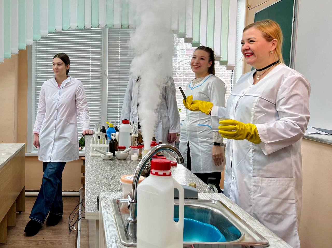 На станции «Лаборатория юного химика» доцент кафедры ЮЗГУ Анна Лысенко устроила для ребят настоящее научное шоу. Под её руководством школьники запускали из колбы «джина», наблюдали за разноцветным пламенем и провели эффектный опыт с марганцовкой, перекисью водорода и моющим средством, получив знаменитую «слоновью зубную пасту».