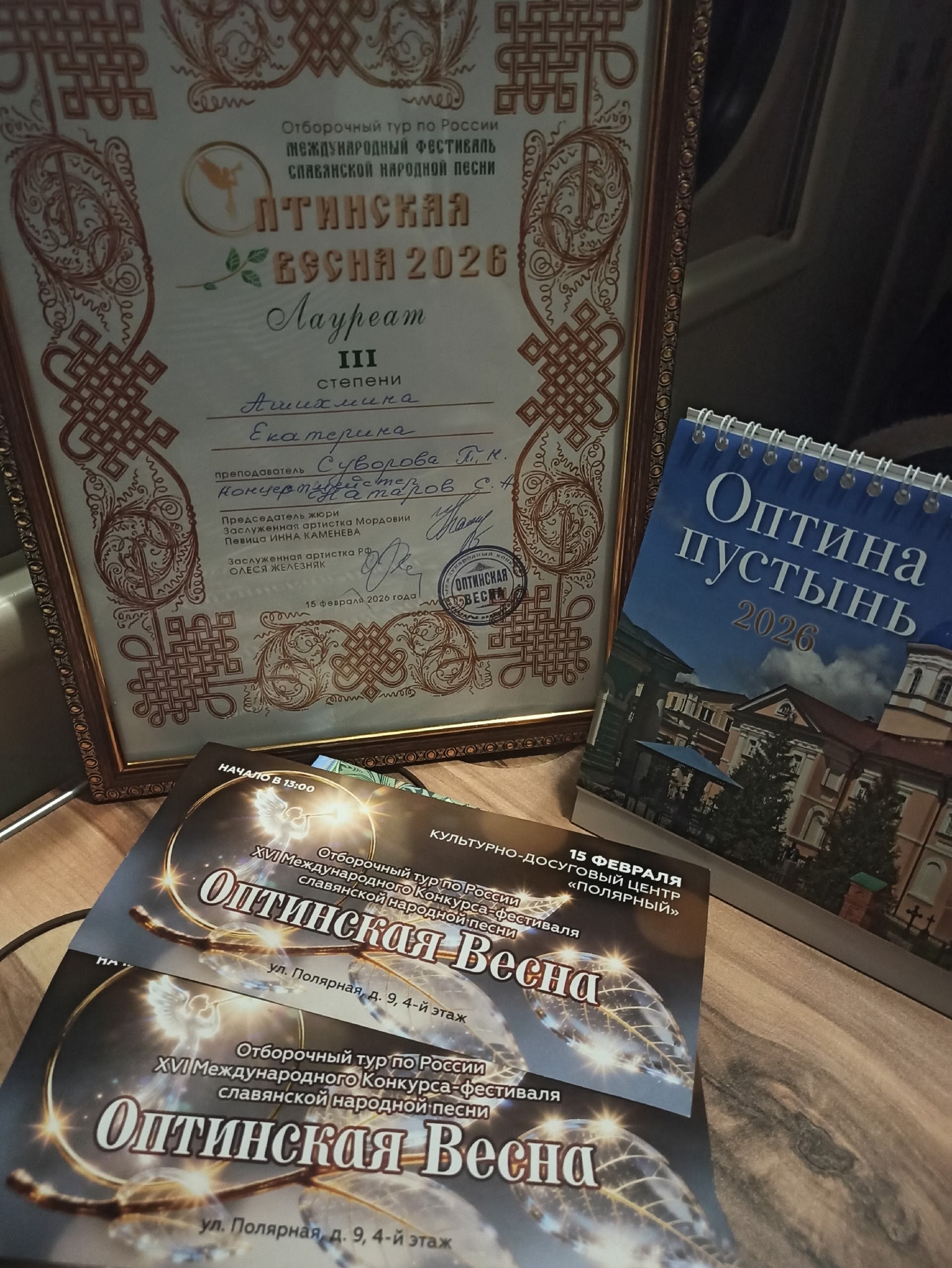 Обучающаяся фольклорного отделения Детской школы искусств Екатерина Ашихмина стала Лауреатом 3-й степени конкурса славянской народной песни «Оптинская весна». Конкурс имеет международный статус и проводится с 2010 года.