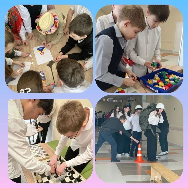 Посещая станции в сопровождении волонтеров – учеников психолого-педагогического и медицинского классов, школьники с большим удовольствием слушали народные масленичные мелодии и песни, играли на импровизированных музыкальных инструментах, собирали на время роботов, играли в шахматы и участвовали в веселых конкурсных викторинах и спортивных соревнованиях, водили хороводы.
