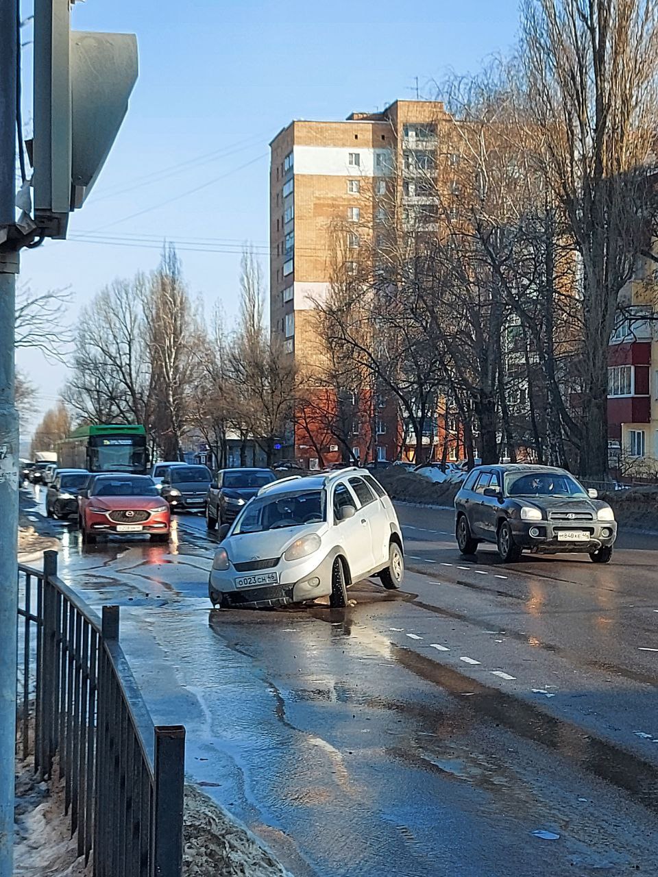 — Сегодня в Курске на повороте на областную больницу легковушка застряла в большой яме. Нет слов...