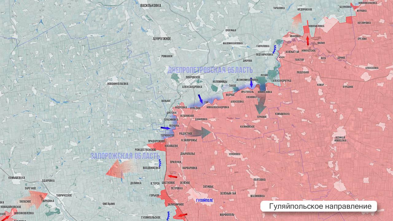 На Гуляйпольском участке, освободив вчера Горькое, ВС РФ подготовили плацдарм для штурма Верхней Терсы с юга, до которой осталось меньше 3 км. Также с этого плацдарма ВС РФ, продвигаясь южнее, охватят низины в районе Гуляйпольского с выходом к трассе на Омельник и соединятся российскими подразделениями в Мирном. За прошедшую неделю армия России в районе Гуляйполя установила контроль над 100 км территории, включая 6 сёл. Выше по фронту наши бойцы удержали Терноватое, стабилизируют ситуацию на севере направления, хотя ситуация в районе р. Волчья остаётся напряжённой.