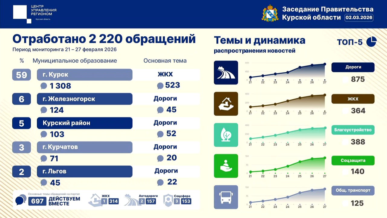 Больше всего обращений в период с 21 по 27 февраля поступило из Курска (1308), Железногорска (124) и Курского района (103).