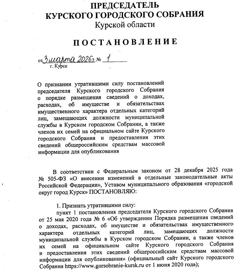 Председатель Курского городского Собрания Владимир Токарев подписал постановление №1 от 3 марта 2026 года, который отменяет действие прежних норм, регулировавших размещение сведений об имуществе и расходах чиновников Горсобрания в открытом доступе.