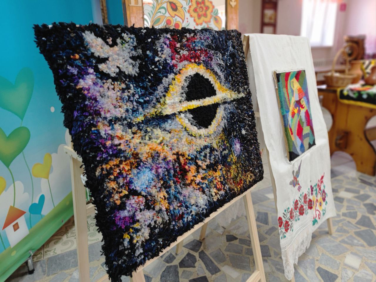 Вниманию учеников были представлены ковры, выполненные Анастасией Двояшовой. Она окончила Суджанский колледж искусств и теперь обучает детей старинному ремеслу и другим видам рукоделия. Для тех, кто желал попробовать свои силы в нелегком деле, мастер провела небольшой урок по ковроткачеству.