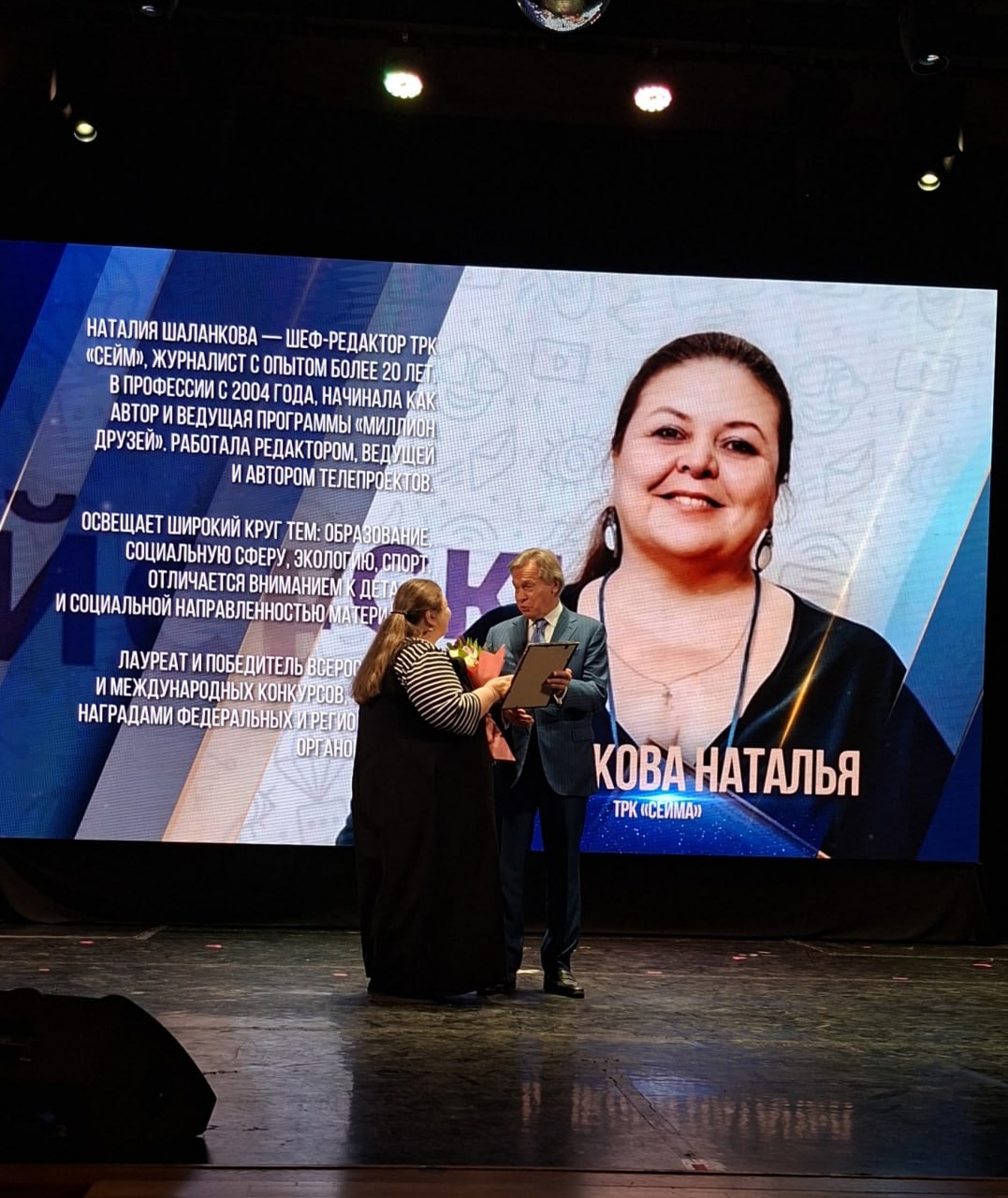 Шеф-редактор ТРК «Сейм» Наталия Шаланкова удостоена «Золотого пера» в номинации «За профессиональное мастерство». Ее журналистский опыт составляет более 20 лет, за эти годы она успела попробовать себя в роли редактора, ведущей, автора телепроектов. Сейчас Наталия освещает широкий круг тем: образование, социальная сфера, экология, спорт.