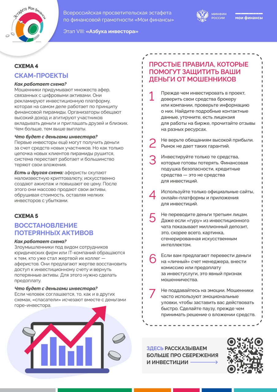 В карточках собрана важная информация о наиболее распространённых схемах инвестиционного обмана. Среди них — лжеброкеры и нелегальные финансовые управляющие, псевдофорекс-площадки, фейковые краудфандинговые проекты, скам-проекты с признаками финансовых пирамид, а также предложения по «восстановлению» уже потерянных активов. Во всех случаях итог один: человек теряет свои средства, а обещания высокой доходности или возврата вложений оказываются обманом.