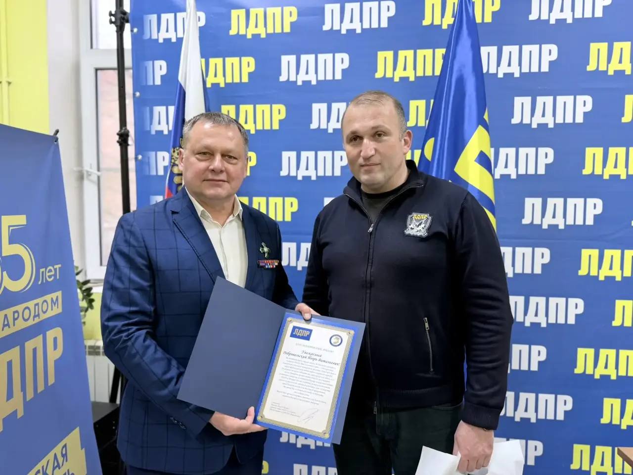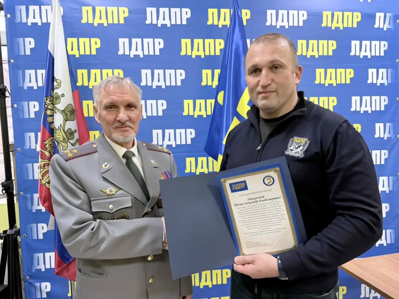 В Курском региональном отделении ЛДПР прошло торжественное мероприятие: координатор Алексей Томанов вручил благодарственные письма ветеранам МВД — полковнику Александру Шахову и подполковнику Игорю Добровольскому.