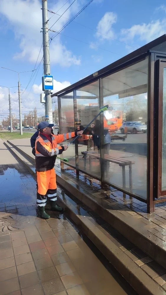 Сегодня рабочие моют остановки и ремонтируют лестницы.