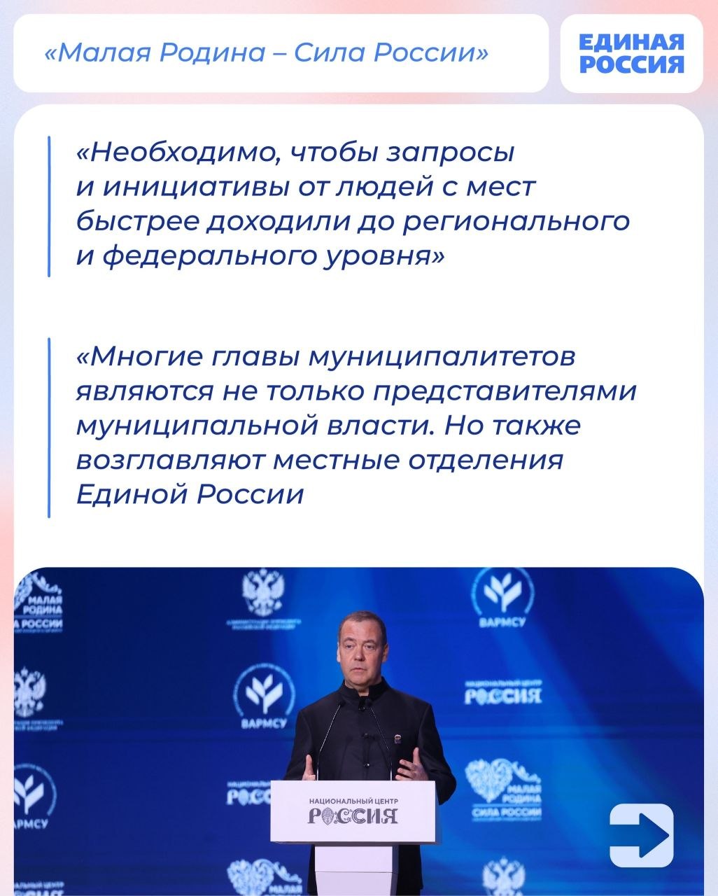 Председатель Единой России, зампредседателя Совбеза РФ Дмитрий Медведев выступил на III всероссийском муниципальном форуме «Малая Родина — сила России».
