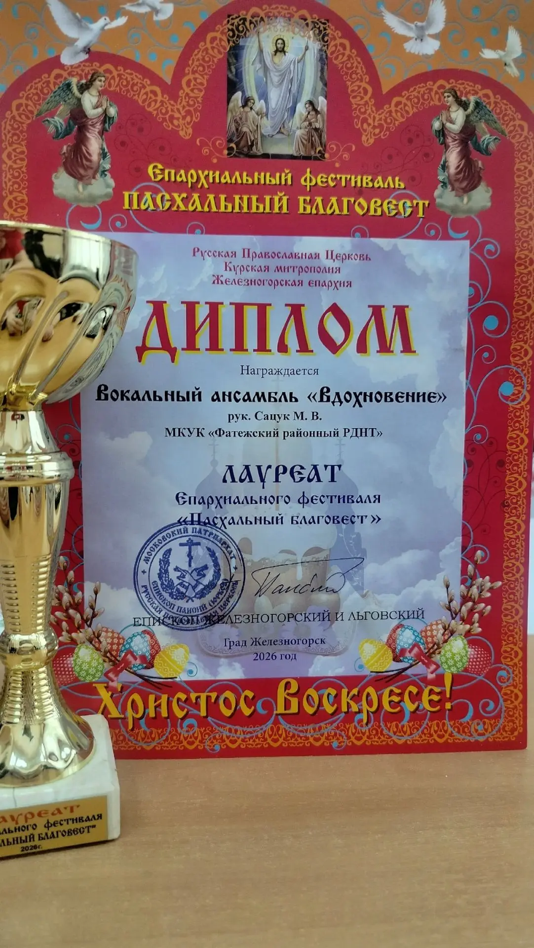 Вокальный ансамбль "Вдохновение" ( рук.Сацук М.В.) Фатежского РДНТ принял участие в епархиальном фестивале "Пасхальный благовест" и был награжден дипломом Лауреата фестиваля. Поздравляем!