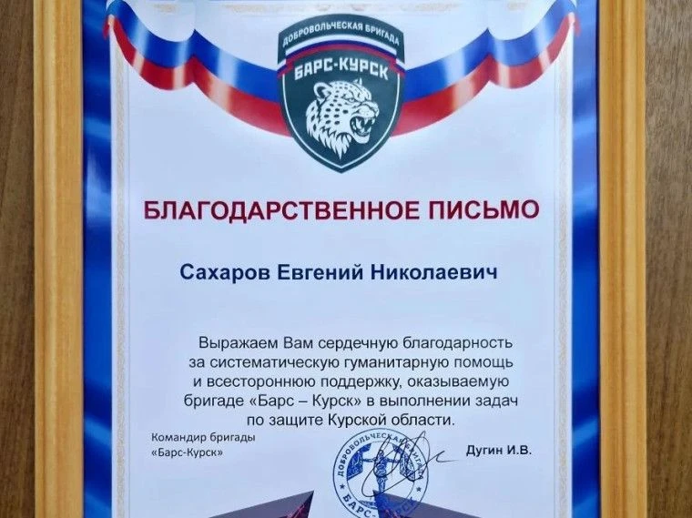 На очередном заседании Штаба по оказанию гуманитарной помощи в связи с проведением СВО и формированию самообороны города Курчатова бойцы бригады «Барс–Курск» вручили Благодарственные письма за подписью своего командира председателю НКО «Фонд поддержки городских инициатив» Е.Н.Сахарову и директору городской спортивной школы И.А.Ситникову за систематическую гуманитарную помощь и всестороннюю поддержку наших защитников.