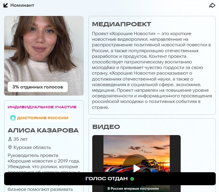 Переходите по ссылке в приложение ВКонтакте: https://clck.ru/3PVo5W и голосуйте за Алису Казарову в номинации «Достояние России».