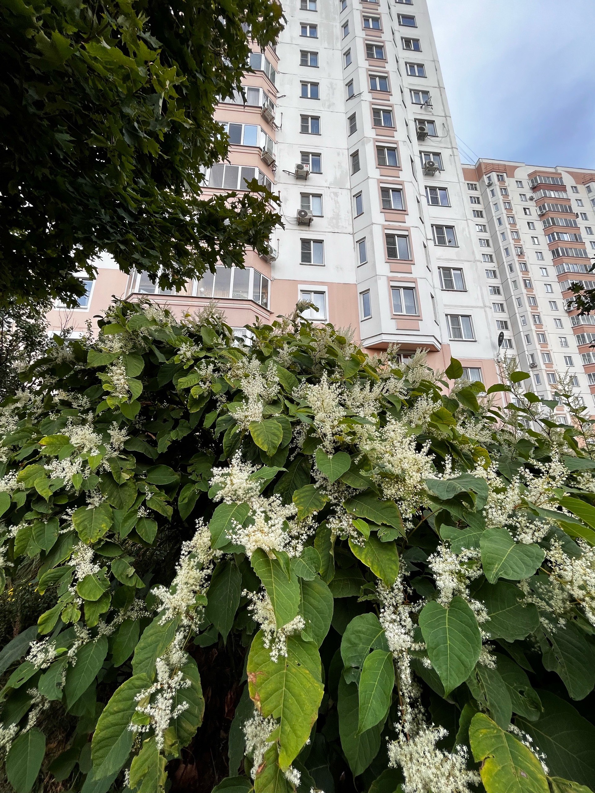 Но даже в такую погоду можно выглядеть хорошо, как например рейнутрия сахалинская, которая сейчас украшает курские дворы весенним настроением. У нее как раз пик цветения.