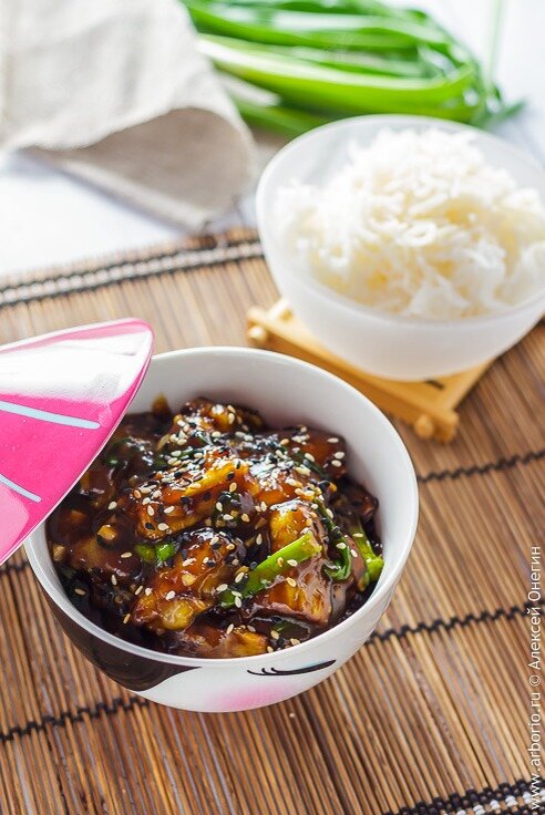Далее следует обжарить баклажаны на разогретом оливковом масле до появления аппетитной золотистой корочки. Тем временем можно заняться приготовлением соуса: в небольшой кастрюле смешиваются соевый соус, сахар, крахмал и вода. После того как смесь закипит, добавляются давленый чеснок и тертый имбирь, готовится до загустения.