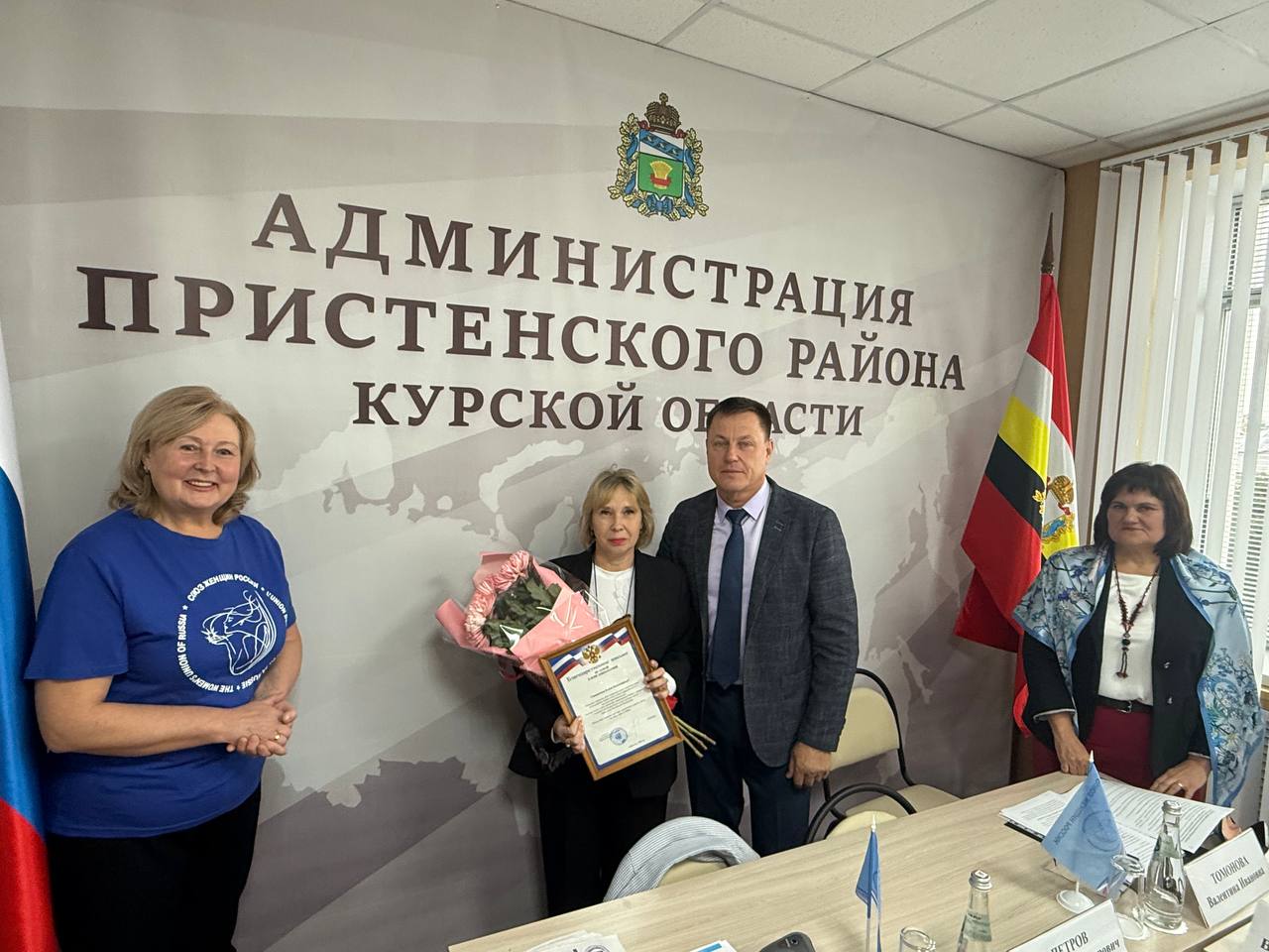 Сегодня в Администрации Пристенского района состоялось отчетно-выборное собрание местного отделения Общероссийской общественно-государственной организации «Союз женщин России». В мероприятии приняли участие заместитель председателя Союза «Федерация организаций профсоюзов Курской области» Татьяна Ивановна Донейко и заведующая отделом маркетинга автономного учреждения Курской области «Телеканал «Сейм» Марина Николаевна Краснящих.