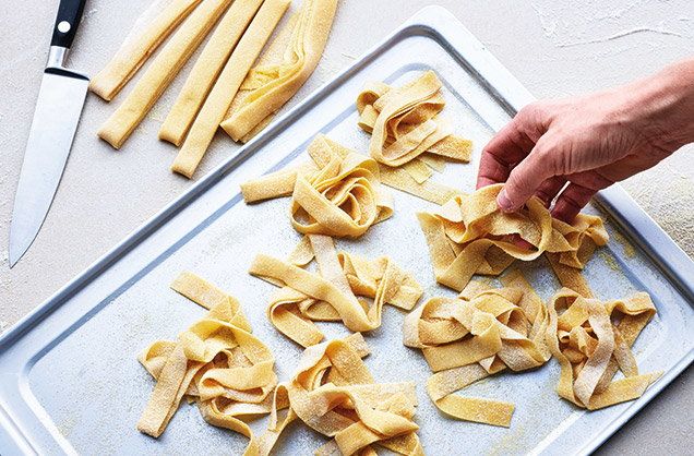 Когда тесто раскатано, нарежьте его на полоски шириной 1,5 см. Оставшиеся полоски следует посыпать манкой, чтобы предотвратить слипание. Выложите нарезанную пасту на противень и накрывайте пленкой, пока готовите остальные порции.