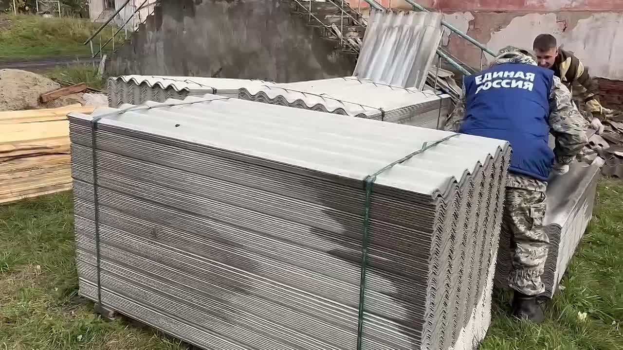 Участники 6 смены волонтерского лагеря Единой России «Курский рубеж» проводят демонтаж поврежденных участков кровли, менят шифер на новый.