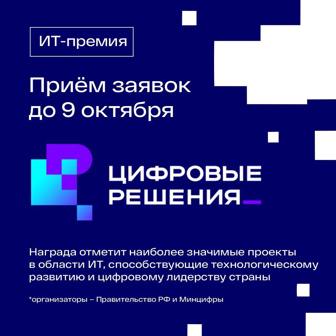 Для тех, кто хочет заявить о своём проекте, войти в число лидеров цифровой трансформации и получить признание профессионального сообщества, пройдёт главная ИТ-премия года «Цифровые решения». На сайте уже стартовал приём заявок, он продлится до 9 октября.
