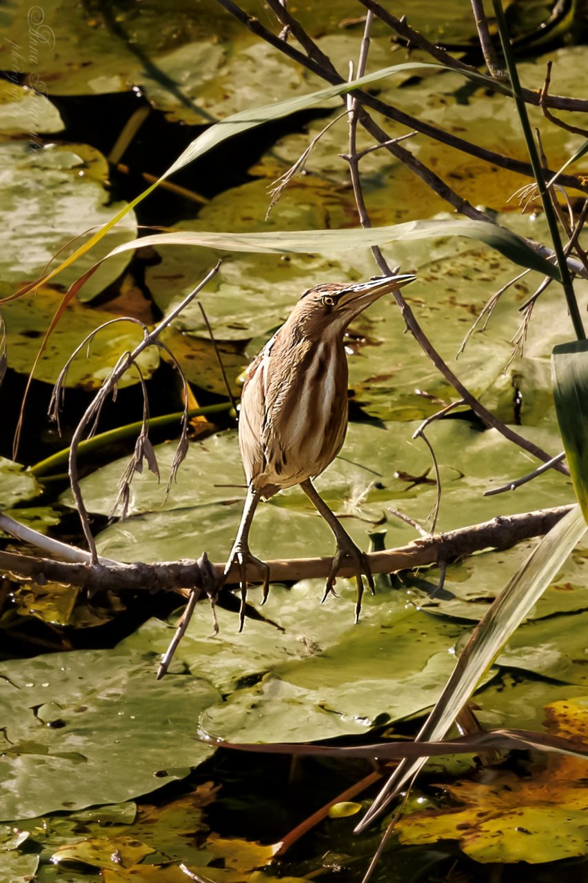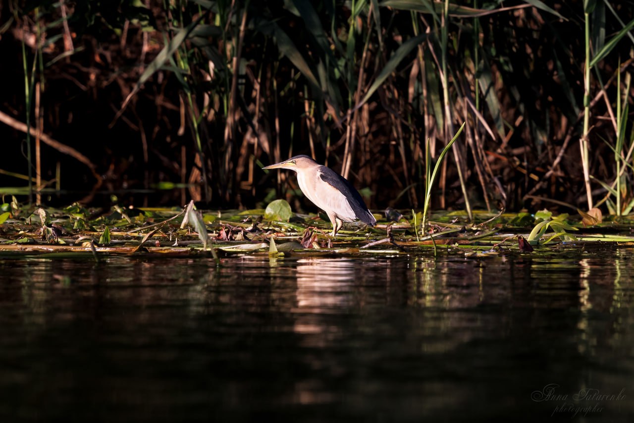 Через зум-объектив она разглядела в камышах неподвижную бежевую «грушу» с полосками и длинными лапами. Внезапно птица вытянула шею и превратилась в цаплю, ловко поймав рыбку. На следующий день рядом появился самец в чёрно-зелёной «шапочке», который даже стрекозу съел, когда рыба перестала клевать.