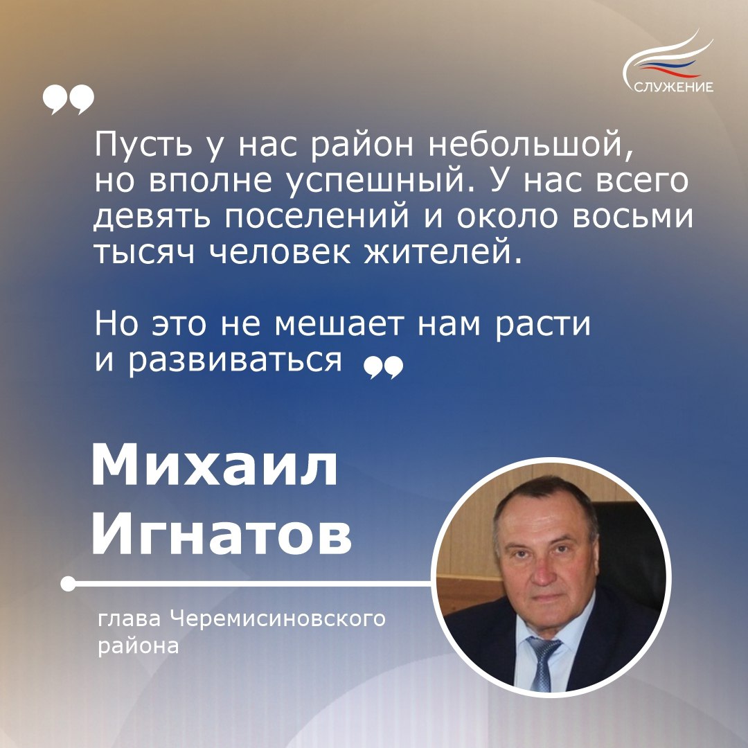 Вот уже 16 лет он возглавляет Черемисиновский район. За это время Михаил Игнатов приобрёл богатый опыт управления, успешно решил много самых разных задач и преодолел немало трудностей, доказывая свою компетентность и профессионализм. Многолетняя работа на посту главы демонстрирует ответственность и преданность своему делу. Благодаря усилиям Михаила Николаевича район развивается динамично, улучшается инфраструктура, повышается благосостояние населения.