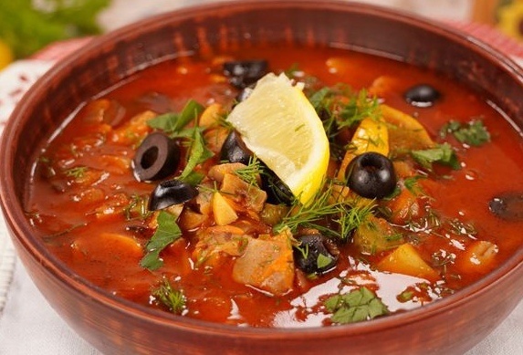 Грибная солянка подаётся горячей, с ломтиком лимона и маслинами для украшения. Это сытное и ароматное блюдо украсит любое меню и придаст ему оригинальности!