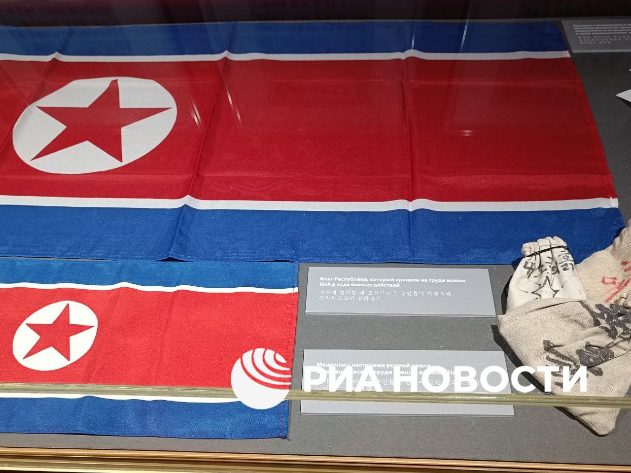Показаны личные вещи бойцов, павших смертью храбрых - государственные флаги КНДР, которые они хранили при себе, мешочек с горстью родной земли, пропитанные кровью письма домой родным, именные жетоны.