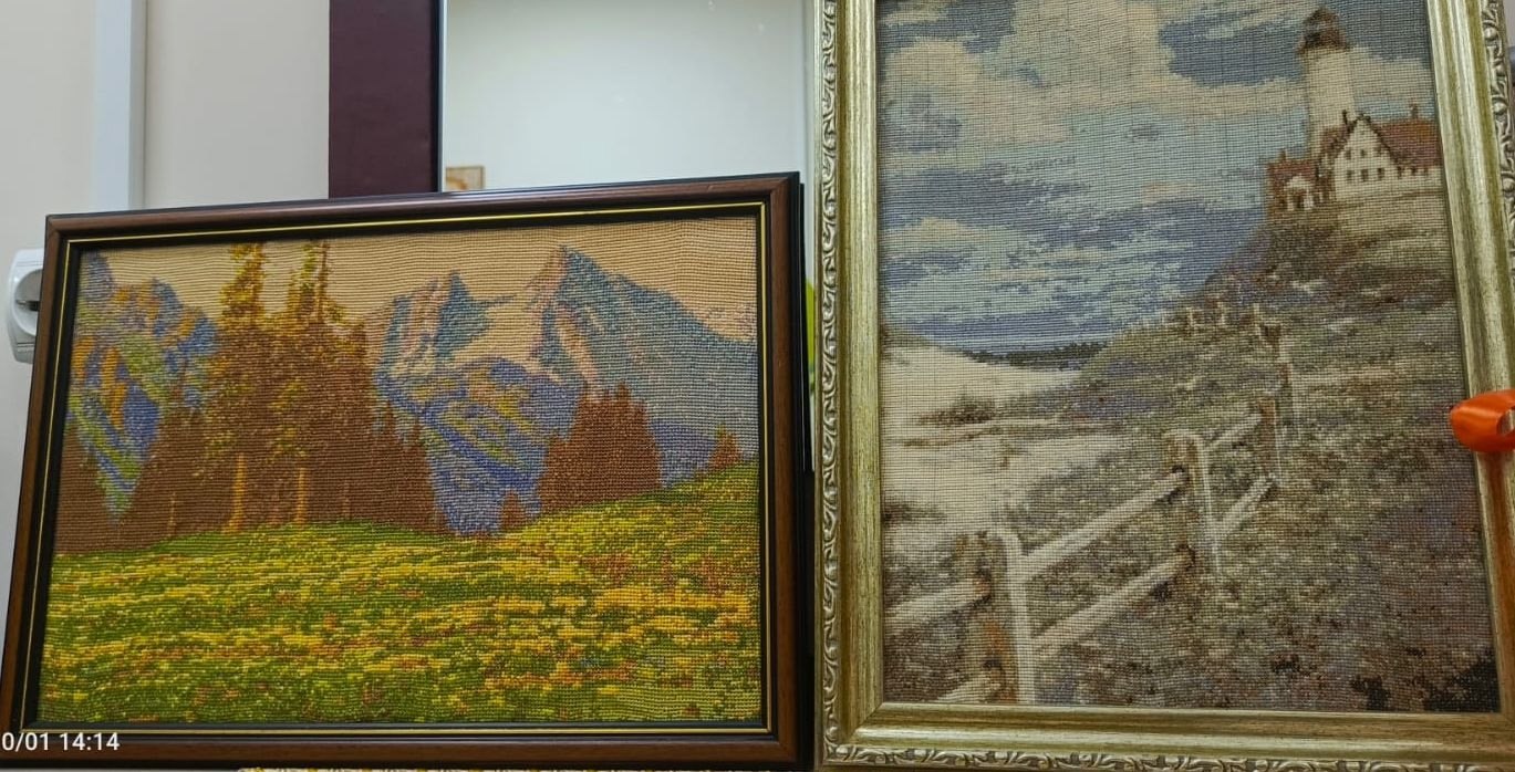 В экспозиции представлены картины, вышитые крестом, бисером и атласными лентами, вязаные игрушки, тряпичные куклы и поделки из глины.