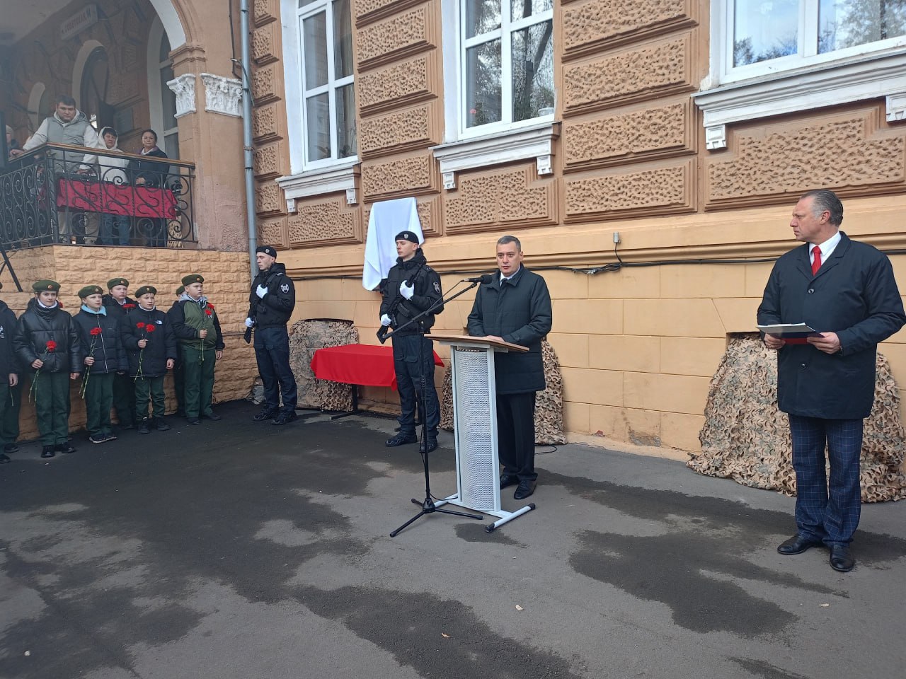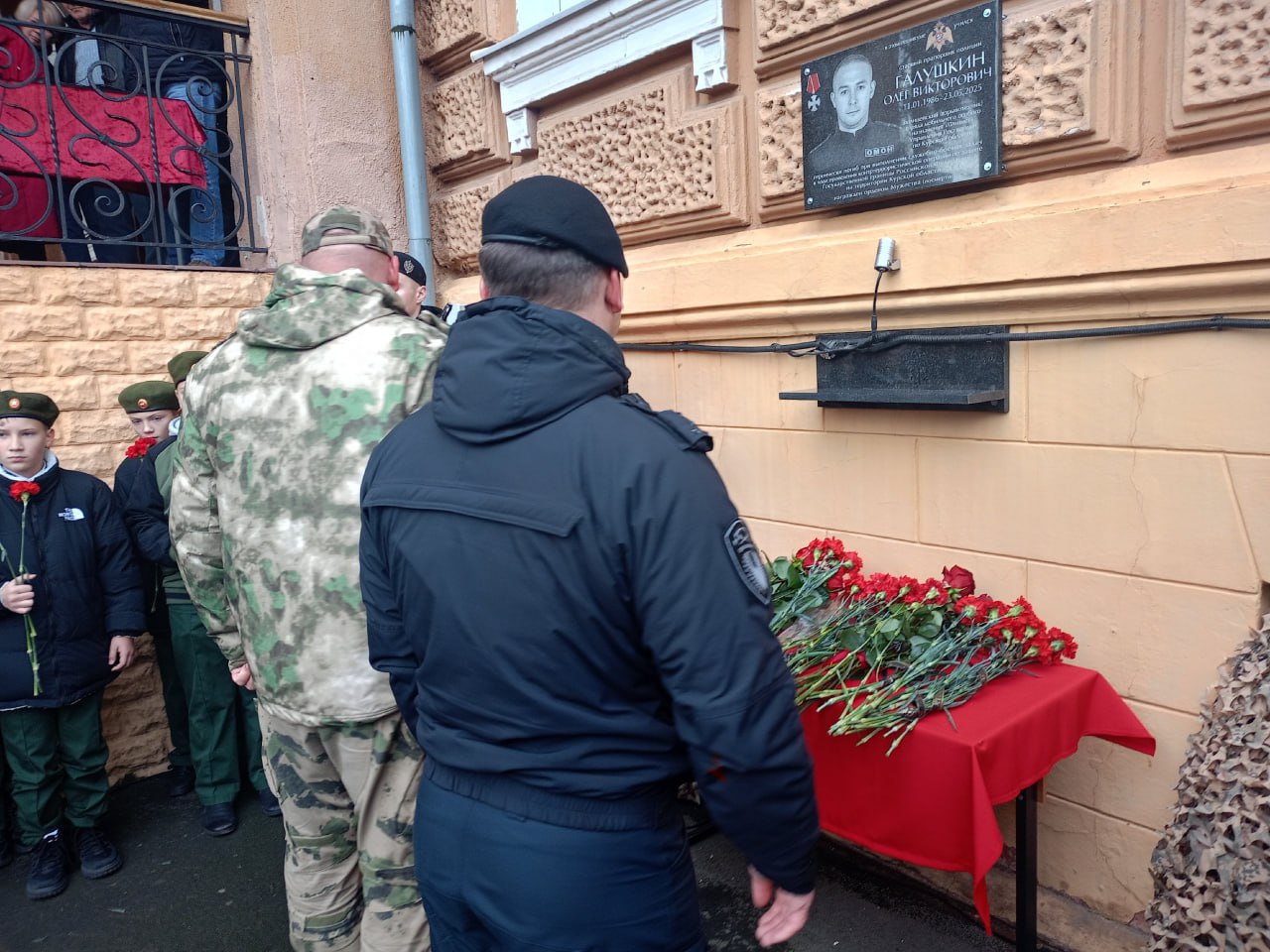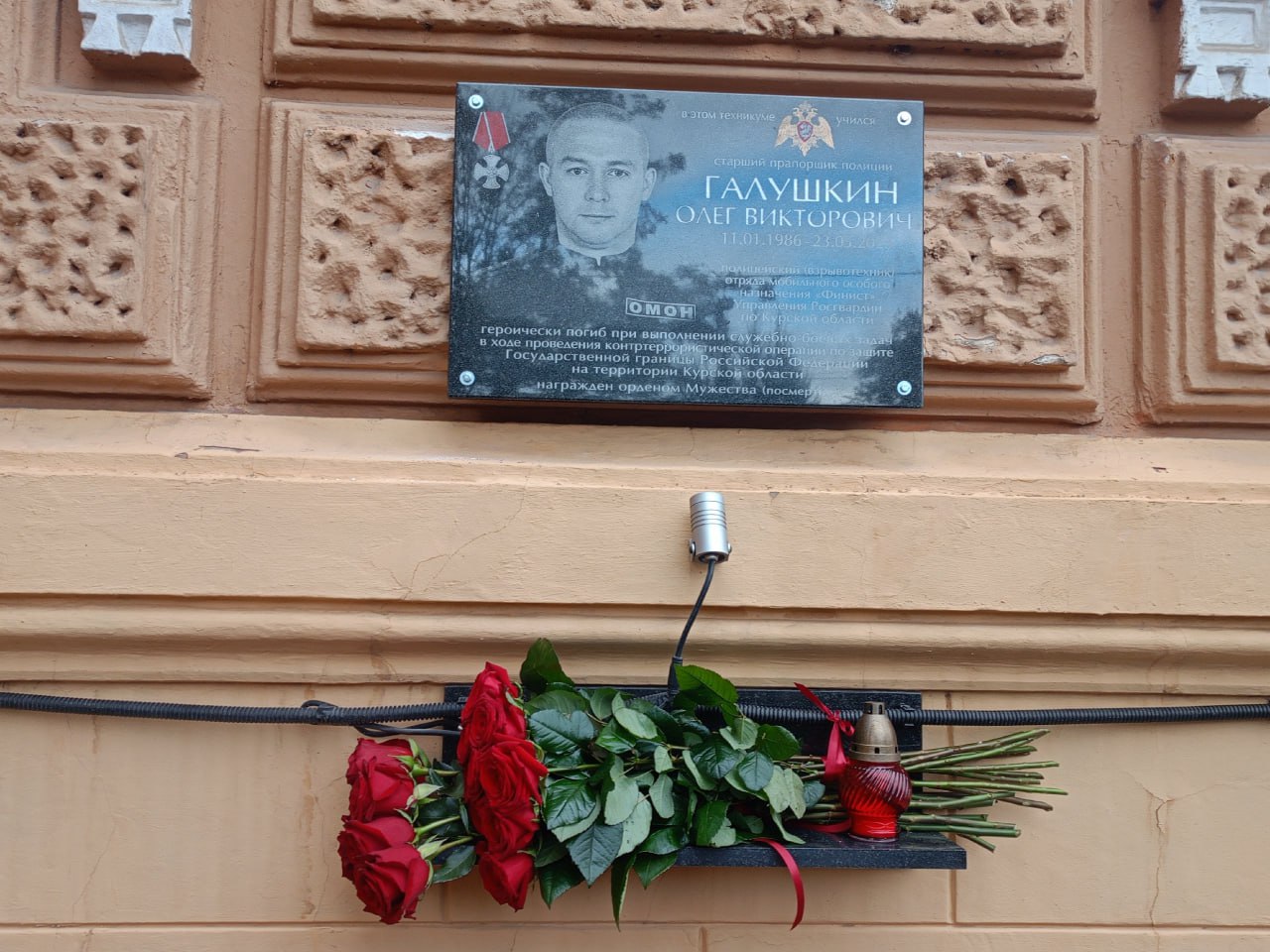 На фасаде Курского монтажного техникума открыли доску памяти Олегу Галушкину. Старший прапорщик полиции Галушкин погиб на границе при выполнении боевого задания 23 мая 2025 года. Ему было 39 лет. Остались родители, жена и двое маленьких детей
