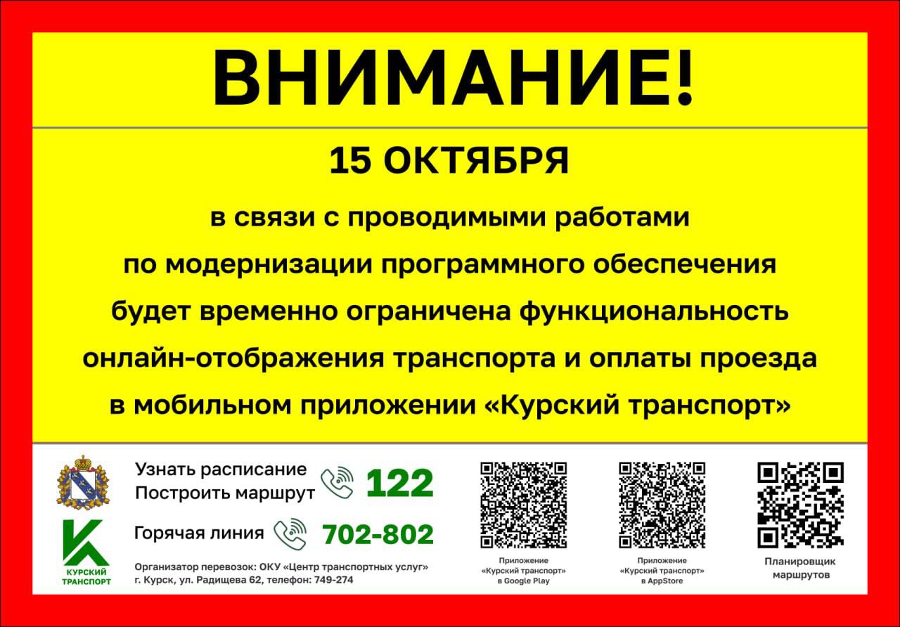 А уже 15 октября возможны временные сбои в приложении «Курский транспорт». Это связано с обновлением программного обеспечения. Может некорректно отображаться движение автобусов, а также возникнуть сложности с оплатой проезда.