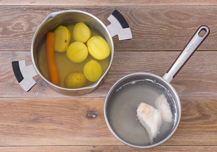 Шаг 1: Тщательно вымойте картофель, разрежьте его пополам и отварите вместе с морковью в кипящей воде. Этот процесс займет около 15 минут, пока овощи не станут мягкими. В отдельной кастрюле отварите куриную грудку порядка 8 минут.