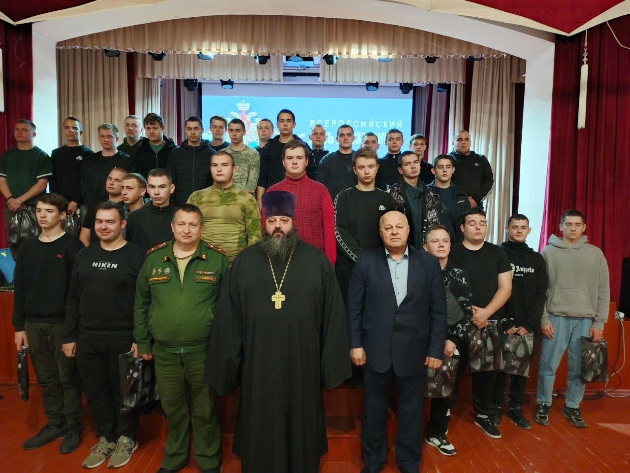 Благочинный Фатежского церковного округа, протоиерей Николай Кобелев благословил призывников и подарил им иконы Божией Матери Тихвинская. Парням также были вручены памятные подарки от администрации Фатежского района.