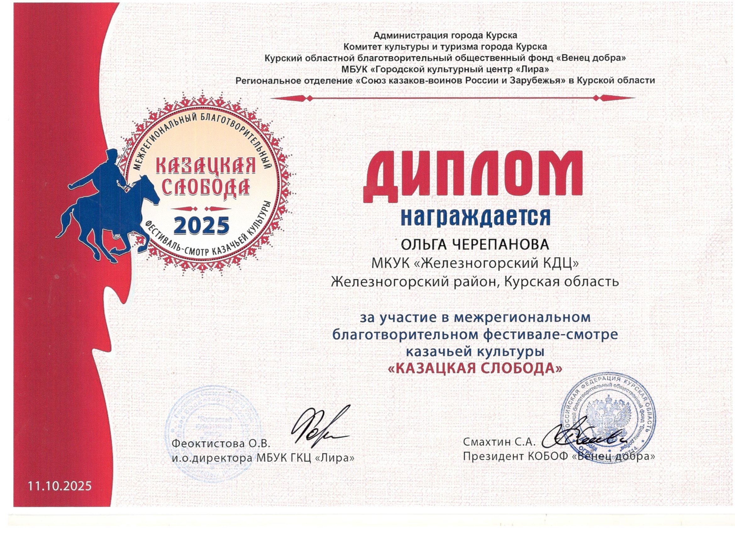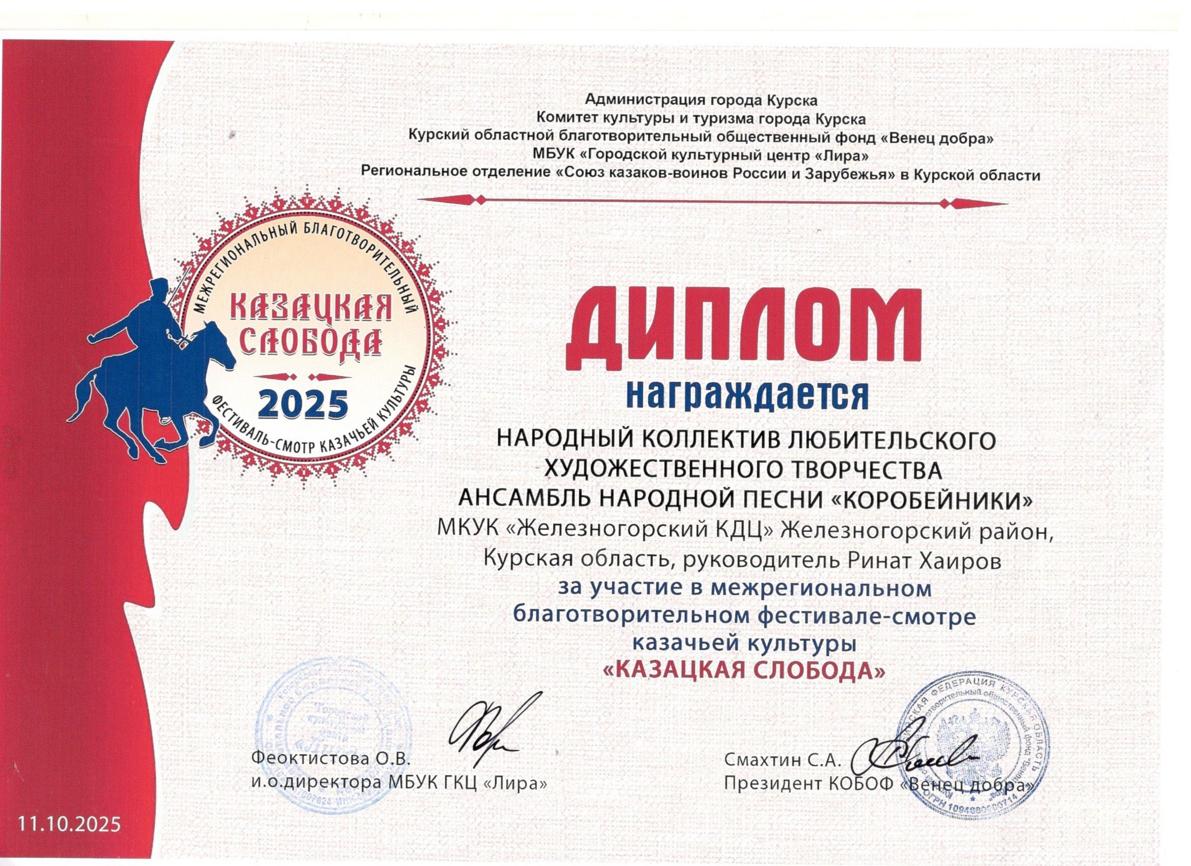 От Железногорского района в фестивале принимал участие Народный коллектив ЛХТ ансамбль «Коробейники»(руководитель Хаиров Р.Г.) Железногорского КДЦ, который вернулся с Дипломом межрегионального благотворительного фестиваля-смотра «Казацкая слобода».