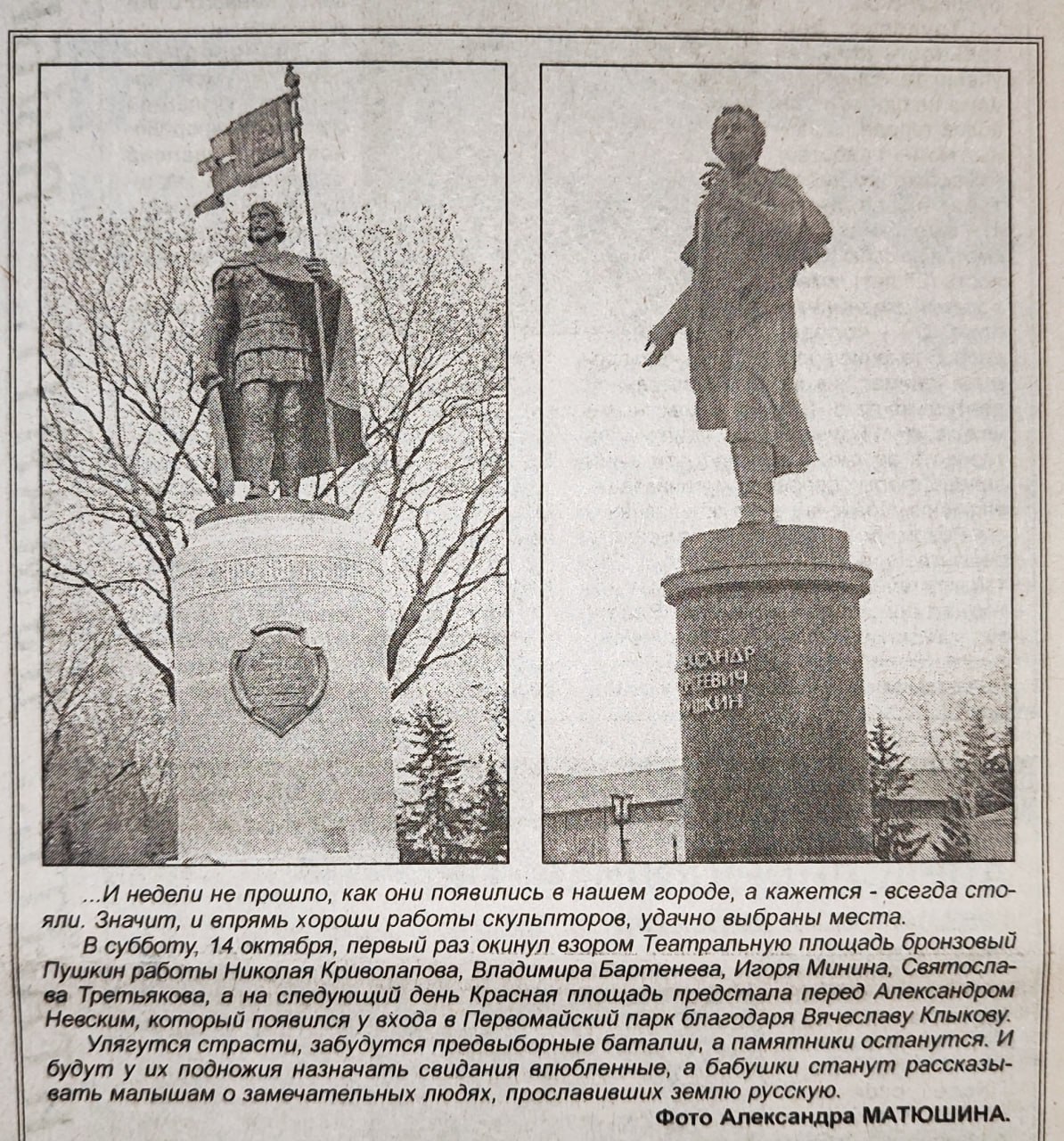 На фото – открытие памятника Александру Невскому в парке имени 1 Мая. Заметка об этом появилась в номере газеты от 19 октября 2000 года. Автор фото: Александр Матюшин.
