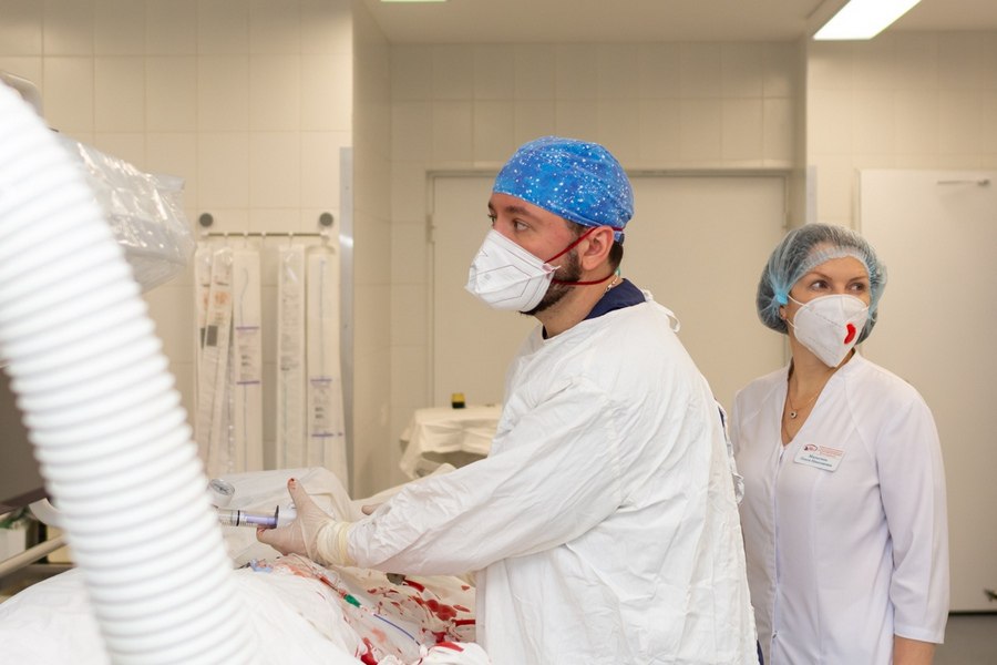 Врачи Валерий Казанов и Алексей Подтуркин сделали маленький надрез в бедренной артерии ноги, ввели миниатюрные инструменты по сосудам до пораженного участка. Затем в артерию установили стент-графт — трубку из полиэстера с металлической опорой, которая усилила слабую стенку сосуда, защищая его от возможного разрыва.