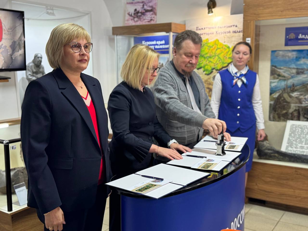 Почетное право поставить первый оттиск специального штемпеля на марки предоставили врио зампредседателя правительства Курской области Оксане Крутько, директору Курского государственного музея археологии Геннадию Стародубцеву и директору регионального УФПС Оксане Бахтиной.