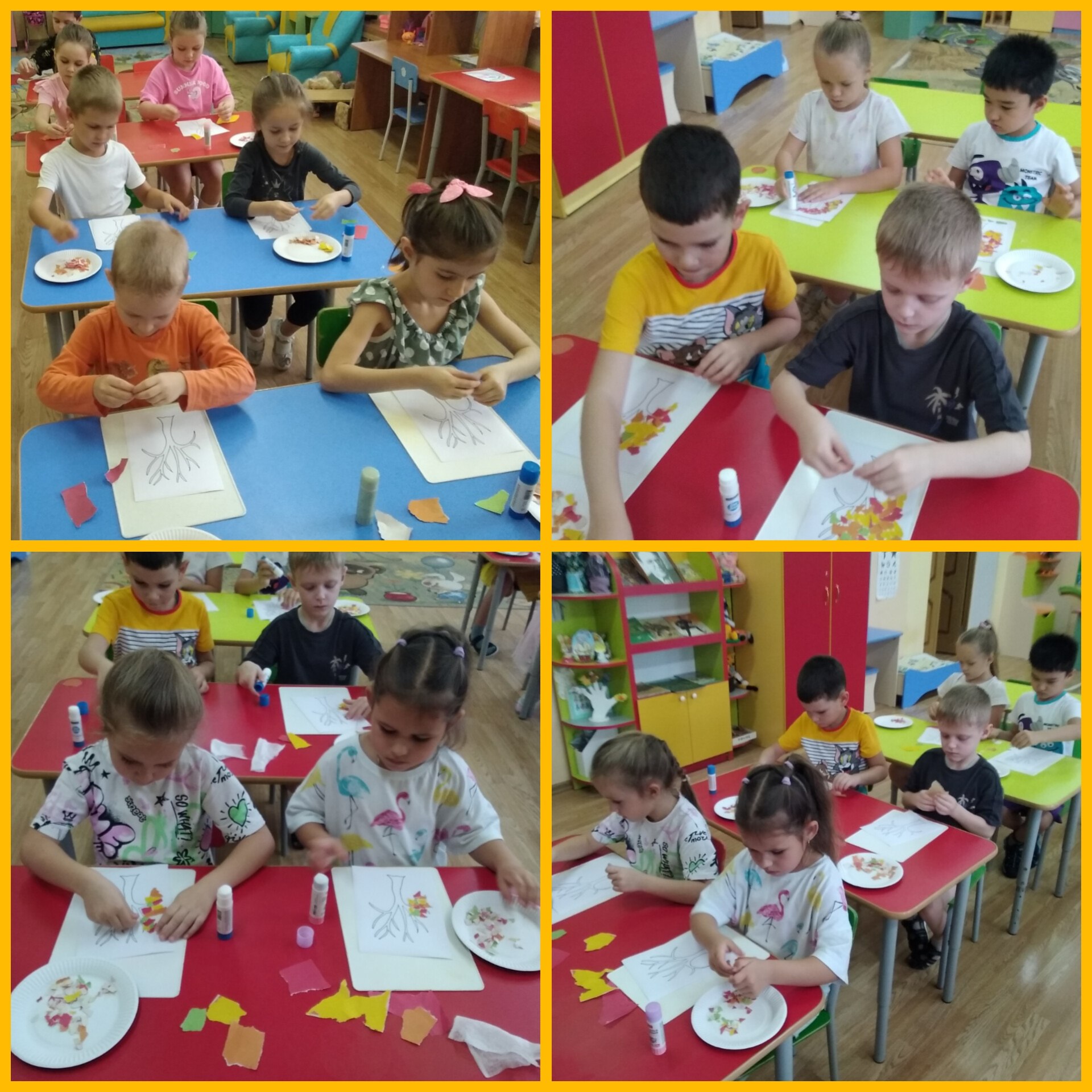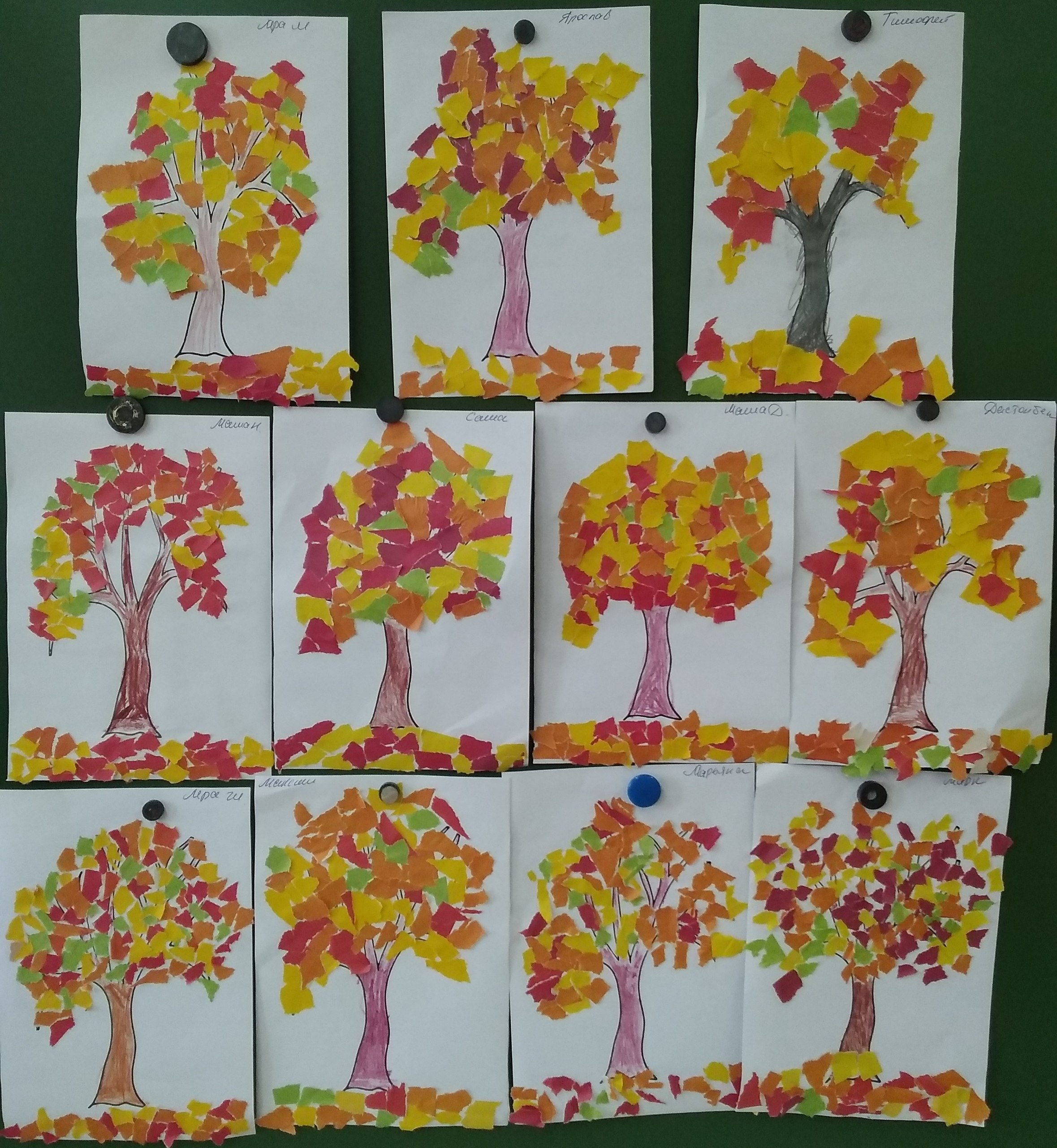 Дети подготовительной группы "Колобок" детского сада "Сказка" выполнили яркую работу в технике обрывной аппликации, создав осеннее дерево с разноцветными листьями