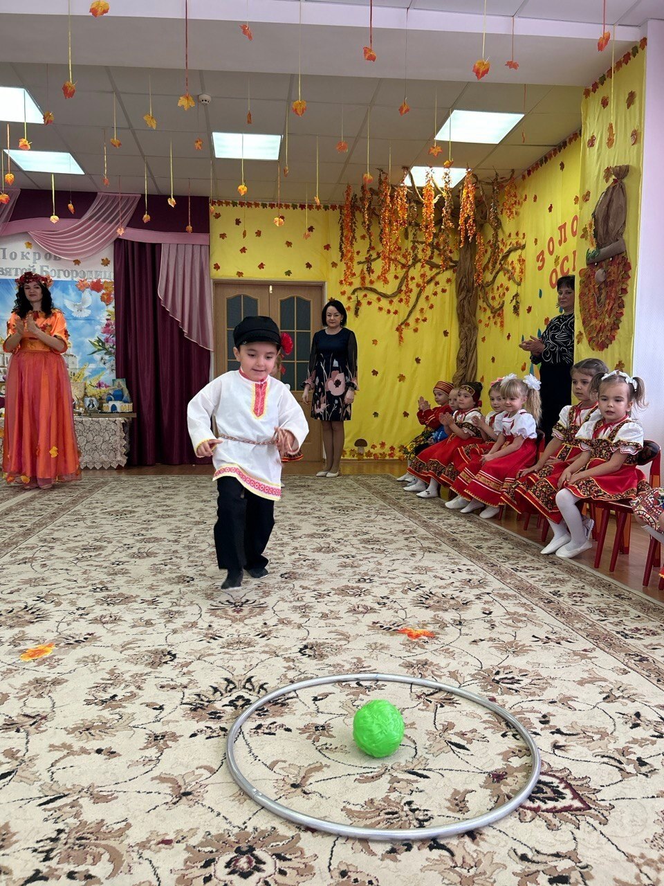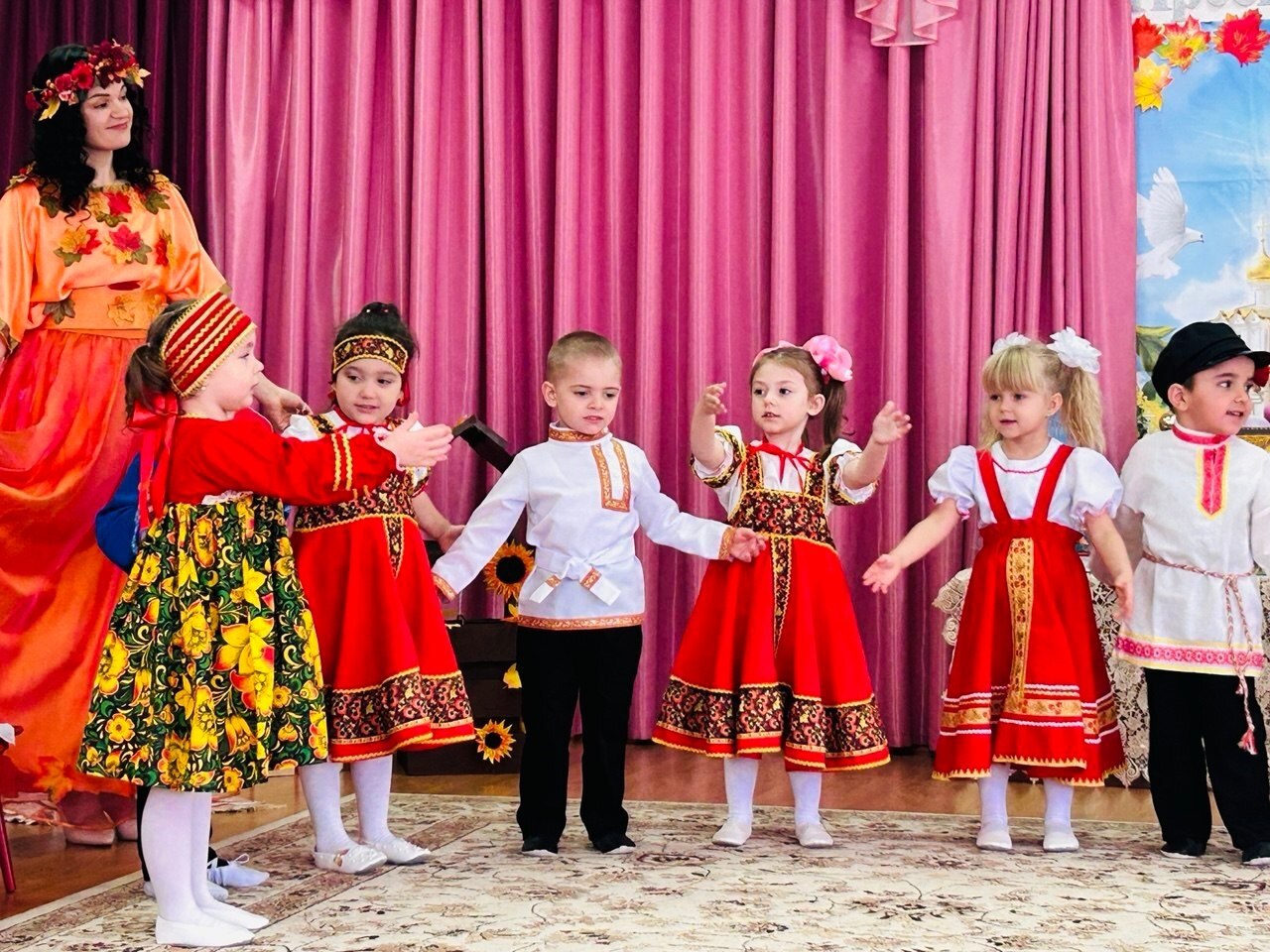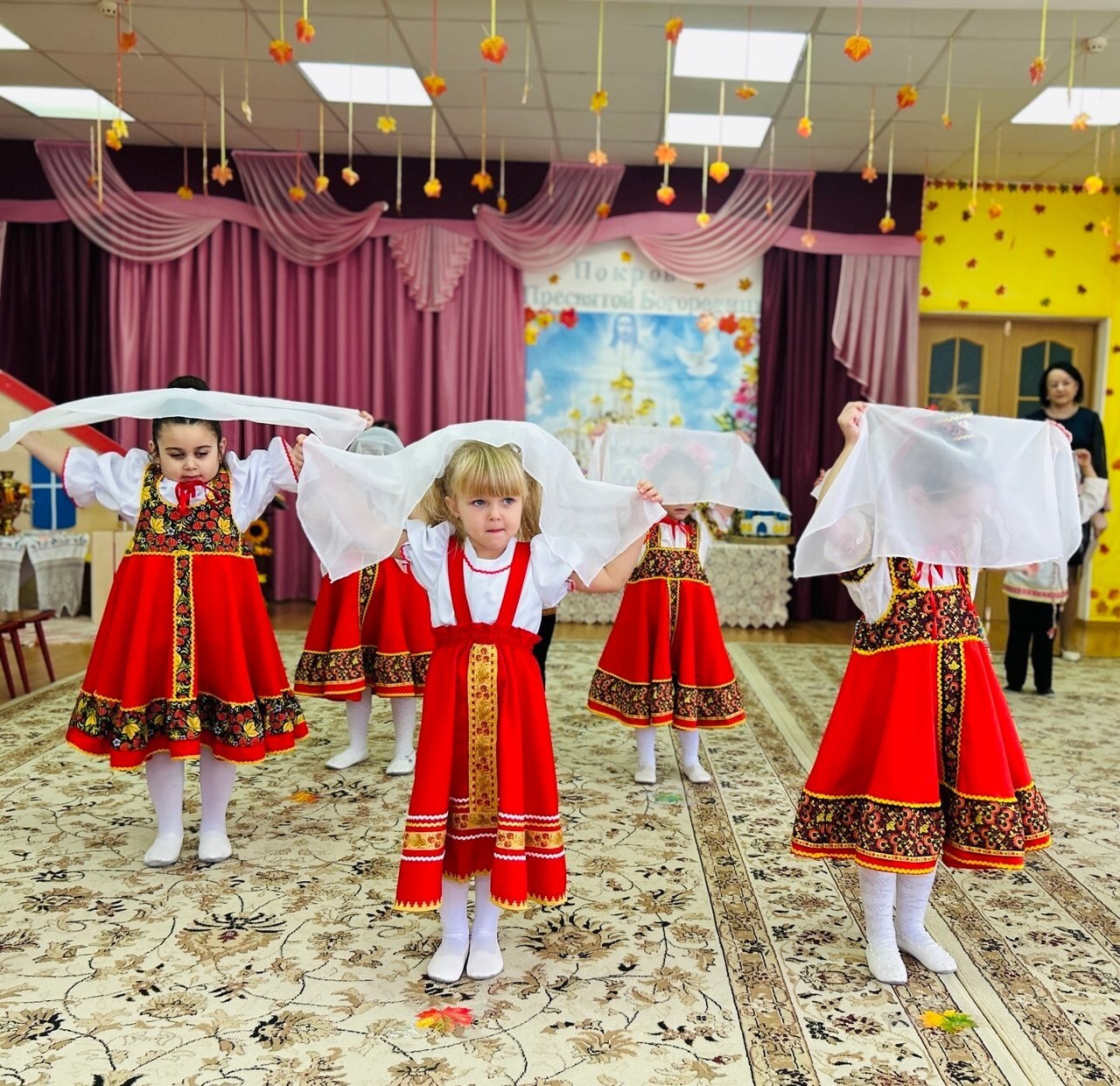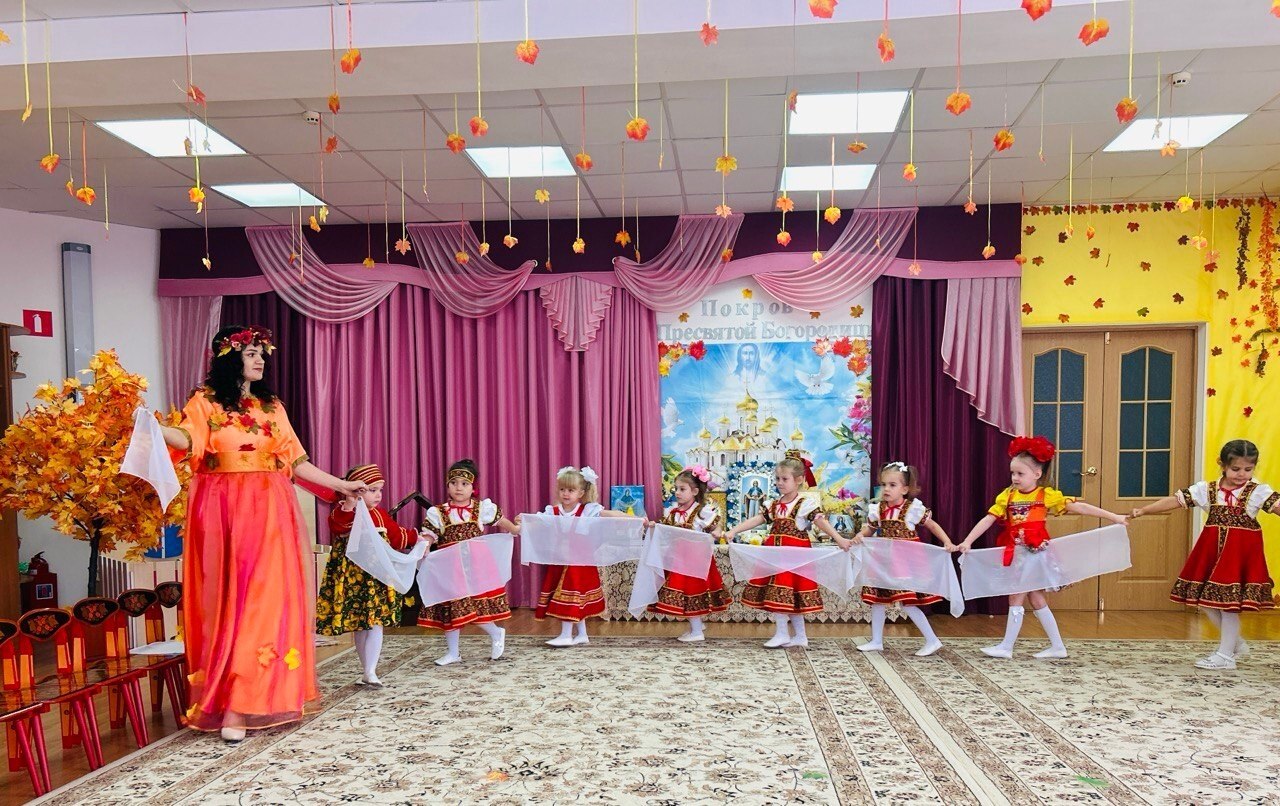Потом дети узнали, как раньше на Руси праздновали Покров: собирали урожай и благодарили Богородицу за заботу. Появилась Осень и раздала каждому малышу платочек — символ защиты и заботы.