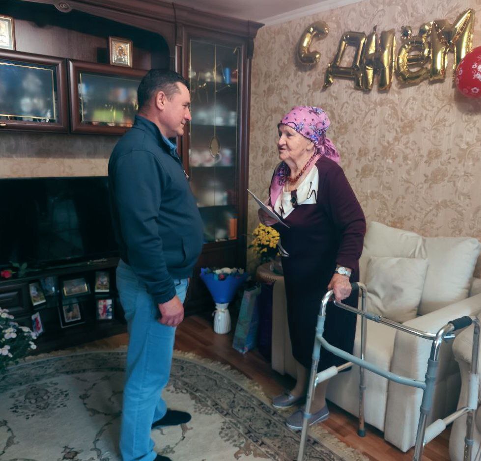 Глава Кореневского района Владимир Жилинков совместно с и.о. заместителя главы администрации Кореневского района Александром Алистратовым передали поздравление Президента РФ и поздравили с юбилеем труженицу тыла.