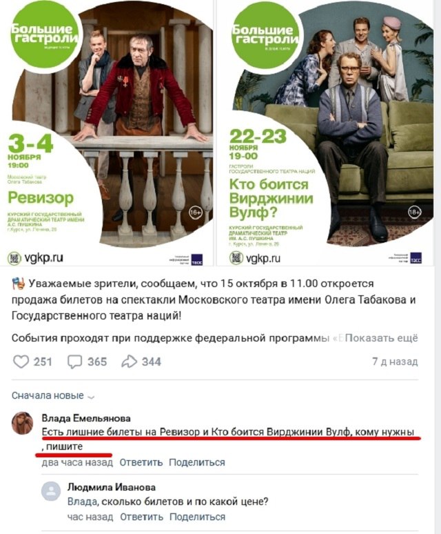 В Курске продолжается ажиотаж вокруг билетов на спектакли с участием известных актеров Владимира Машкова и Евгения Миронова, запланированных на ноябрь. Теперь в комментариях под постом в группе Курского драмтеатра сообщают, что есть лишние билеты и предлагают желающим связаться в личных сообщениях.