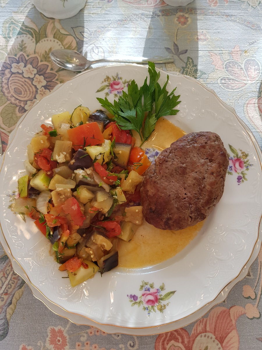 Что касается рагу, то начать следует с обжаривания лука на растительном масле. Затем к нему добавляется нарезанный сладкий перец, баклажаны и кабачки. Овощи готовятся до мягкости. После этого следует добавить нарезанные кубиками помидоры, посолить и поперчить. Блюдо тушится 10 минут, после чего добавляются чеснок и зелень. Рагу получается ароматным и прекрасно дополняет котлеты, создавая идеальный осенний обед.