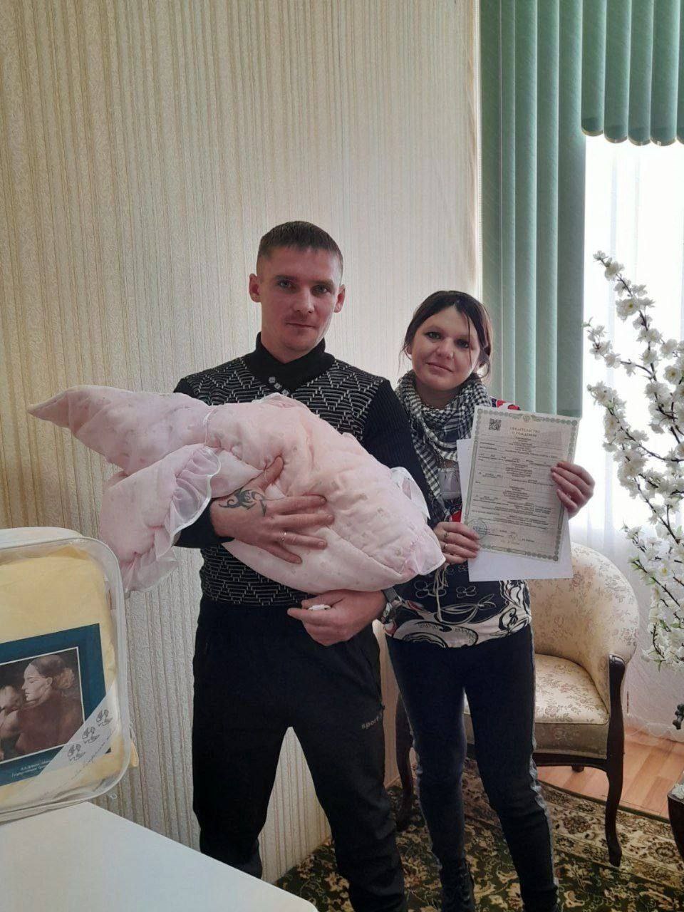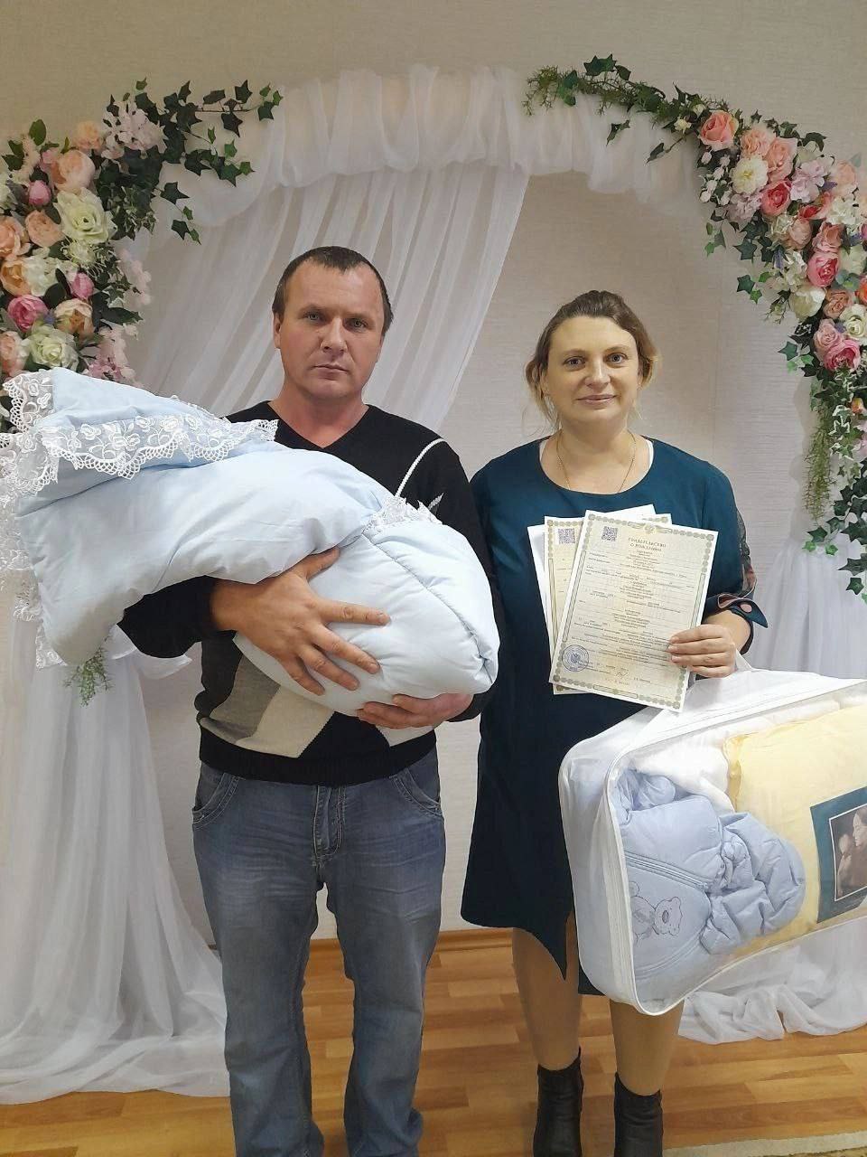 Вместе со свидетельством о рождении родителям выдается справка для назначения единовременного пособия при рождении ребенка, а также подарок от Губернатора Курской области.