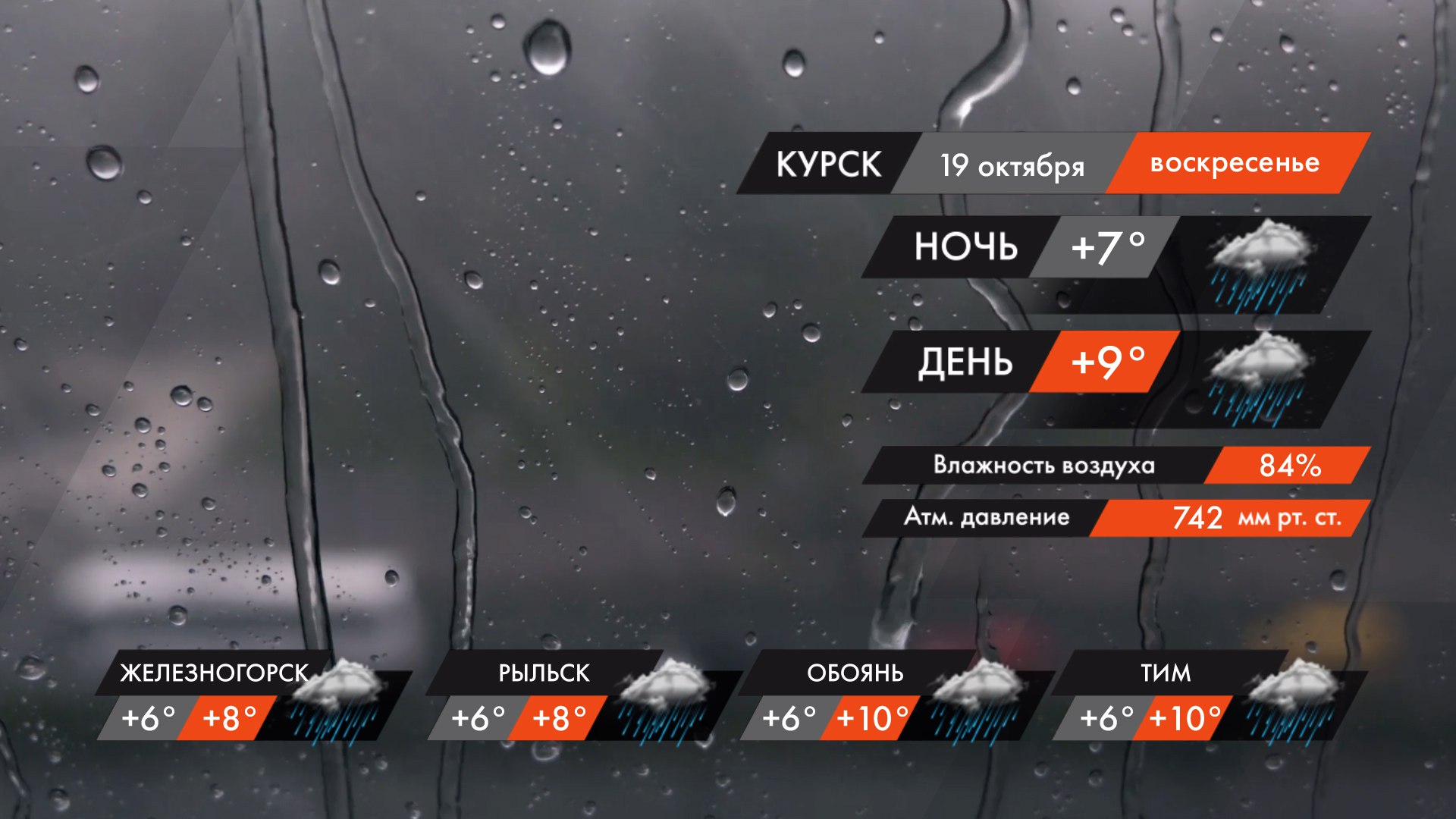 В воскресенье 19 октября в Курске будет облачно. Ночью небольшие, местами умеренные дожди, днем временами дожди. Ночью местами туман.