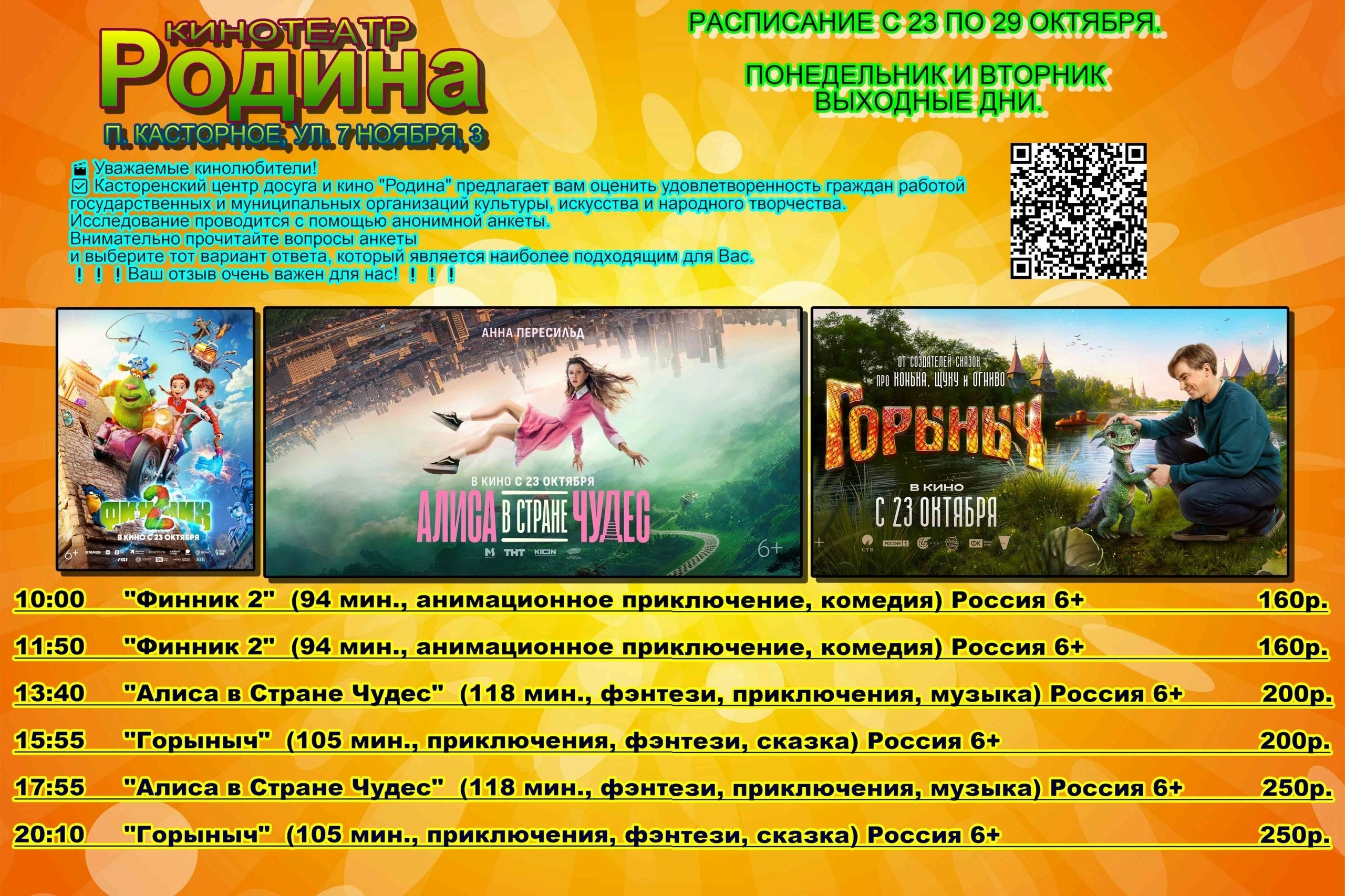 С 23 по 29 октября мы приглашаем вас посетить ЦДК «Родина» и погрузиться в мир кино! Новое расписание уже готово, чтобы вы могли спланировать свои самые яркие киновыходные.