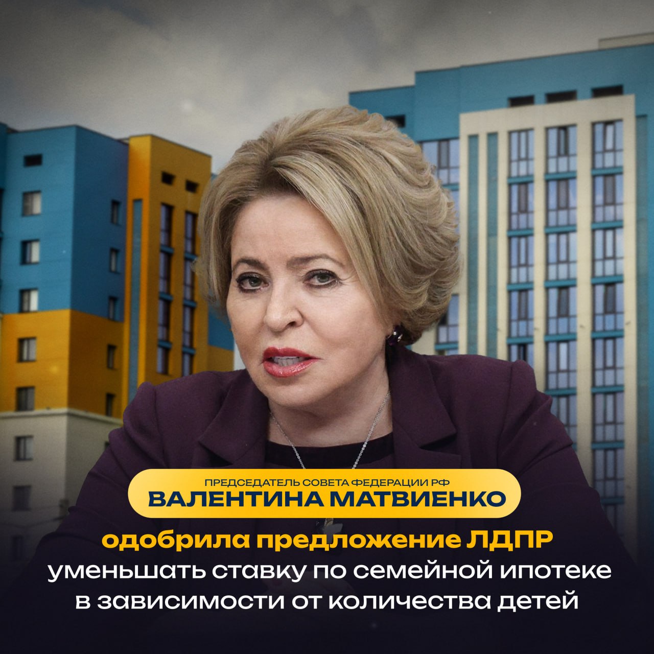 На Совете по реализации государственной демографической и семейной политики председатель Совета Федерации Валентина Матвиенко рассказала Владимиру Путину о необходимости помогать семьям, чтобы они могли улучшать жилищные условия у себя в регионах. Она предложила президенту дифференцировать ставку по семейной ипотеке в зависимости от количества детей.