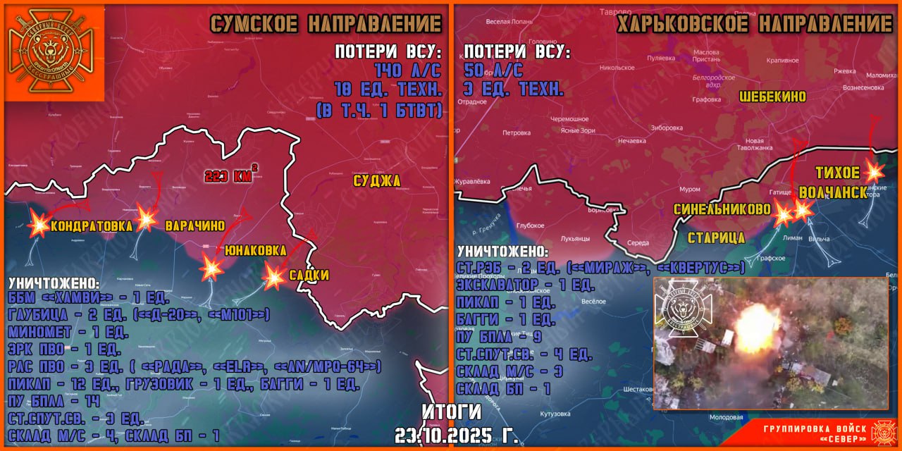 За сутки потери противника составили свыше 190 человек (из них более 140 в Сумской области и свыше 50 в Харьковской). Также вскрыто и уничтожено: