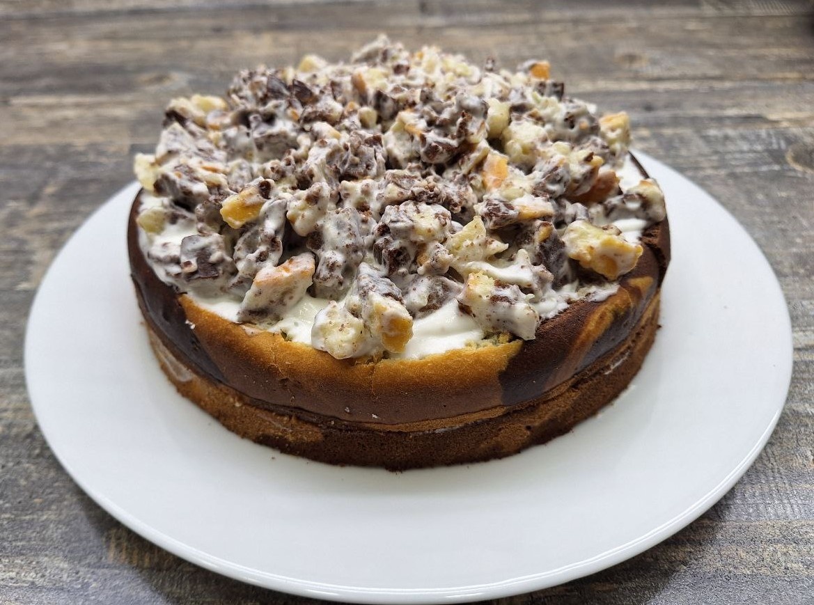 Для формирования «зебры», в подготовленную форму (диаметр около 22 см) поочередно выливаются светлое и темное тесто, что создает эффект чередующихся полос. Выпекать в заранее разогретой духовке (180 °C) придется 35–40 минут. Готовность проверяется вставленной в пирог деревянной палочкой. После остывания верхушка аккуратно срезается для украшения.