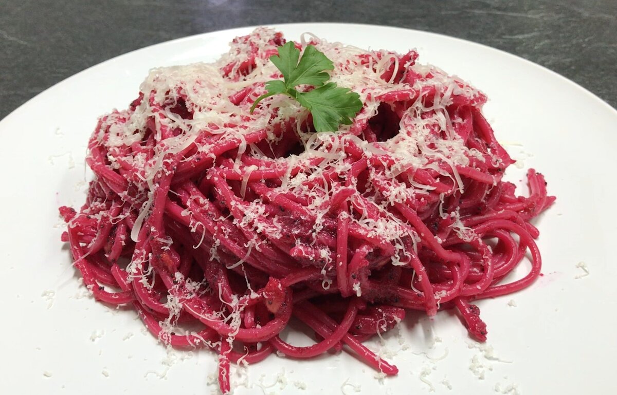 Отварите пасту до состояния аль денте, сохранив 70 мл воды, в которой она варилась. На сковороде подсушите мак на среднем огне, затем добавьте оливковое масло, измельчённый чеснок, свекольное пюре, соль, перец и отложенную воду. Хорошо перемешайте, пока сыр не расплавится. В конце добавьте пасту и тщательно объедините ингредиенты.