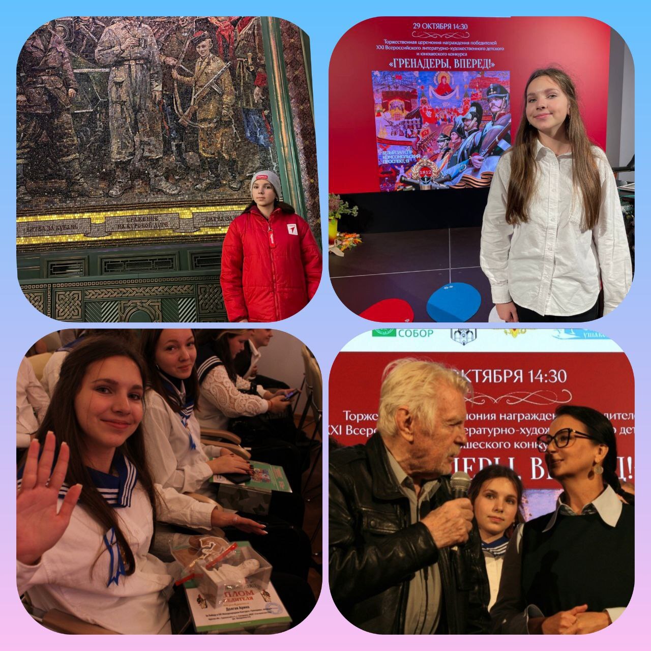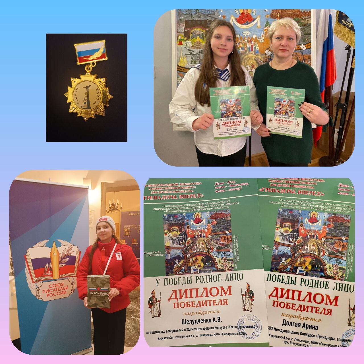 29 октября в Союзе писателей России состоялась торжественная церемония награждения победителей XXI Всероссийского литературно-художественного детского и юношеского конкурса «Гренадеры, вперёд!». Долгая Арина, обучающаяся МКОУ «Гончаровская СОШ» Суджанского района Курской области, ставшая лауреатом регионального этапа, одержала победу на международном уровне. Руководитель творческой работы - учитель русского языка и литературы Анна Викторовна Шелудченко.