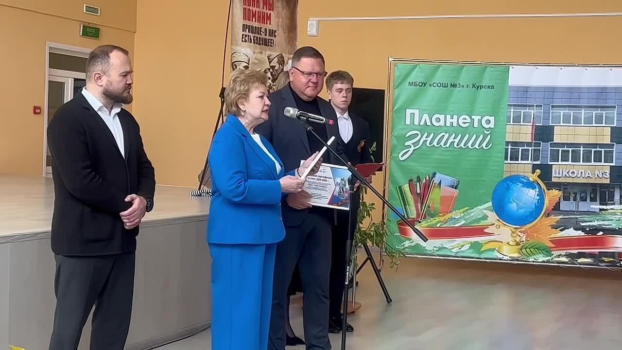 В школе №3 в присутствии труженика тыла, лётчика, ветерана военной службы Виктора Григорьевича Шатохина, отмечавшего свой 95-летний юбилей, региональный координатор партийного проекта Единой России «Историческая память» Алла Чертова вручила коллективу награду за третье место во Всероссийском конкурсе школьных музеев «Знать, чтобы помнить».